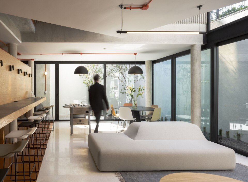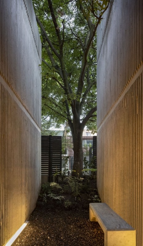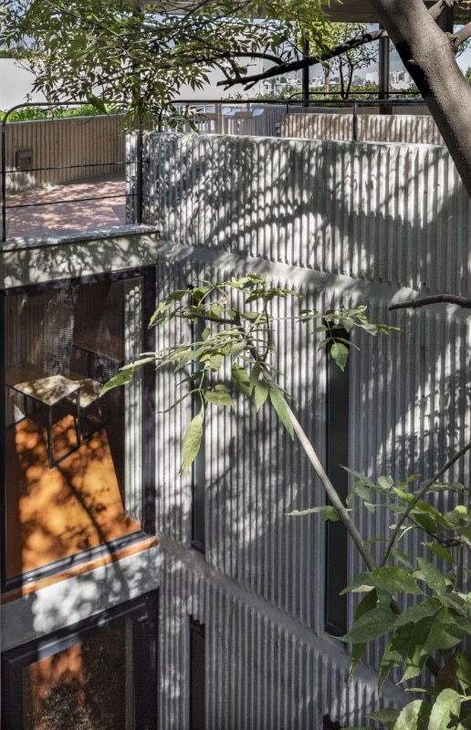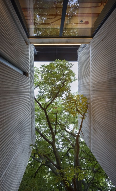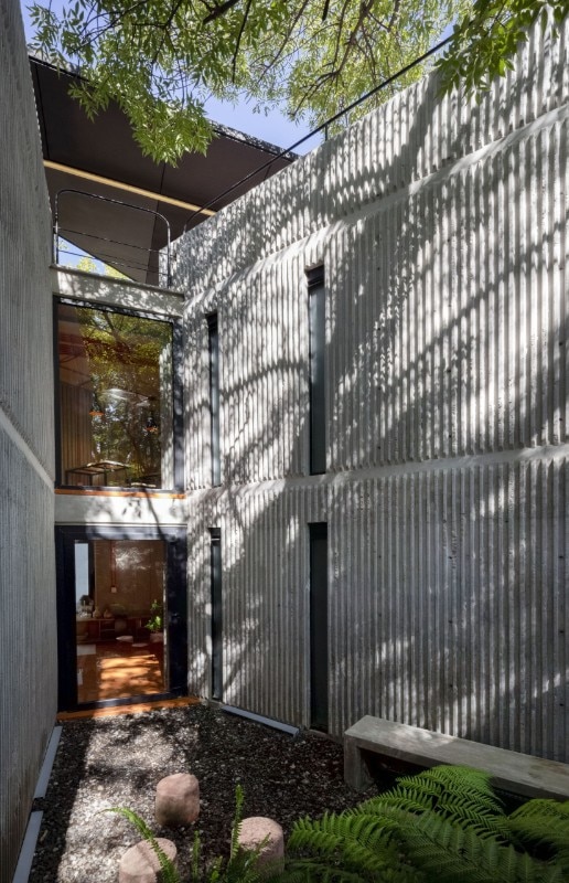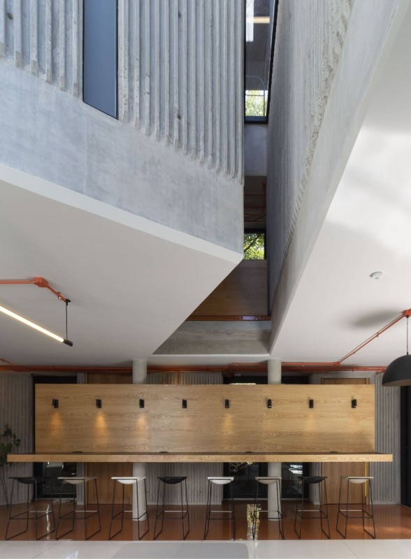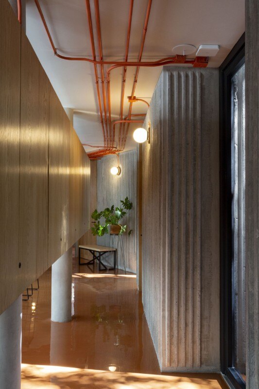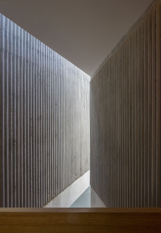 It is in fact the prominent use of corrugated concrete that marks the project. After several trials of formwork in metal and wood slabs, the designers developed a technique in which the corrugation is slightly inclined rather than being at right angles, to avoid breaking the waves. Each wall is thus different from the next and unique in space.