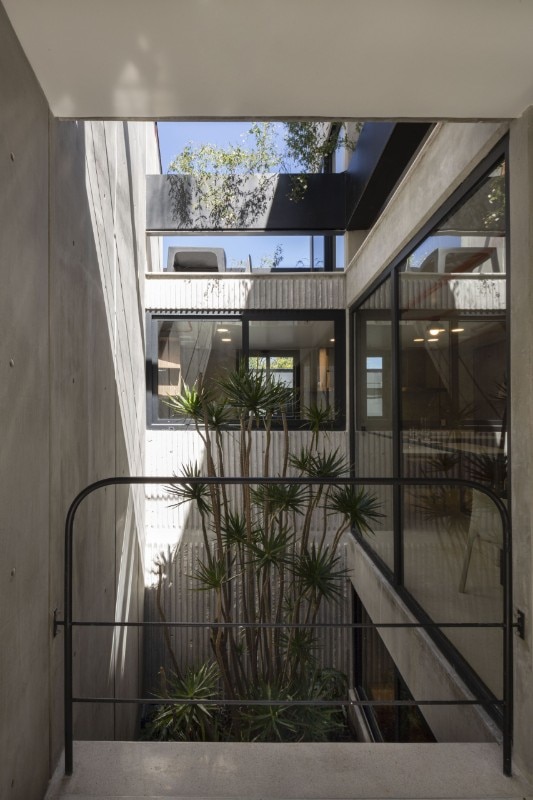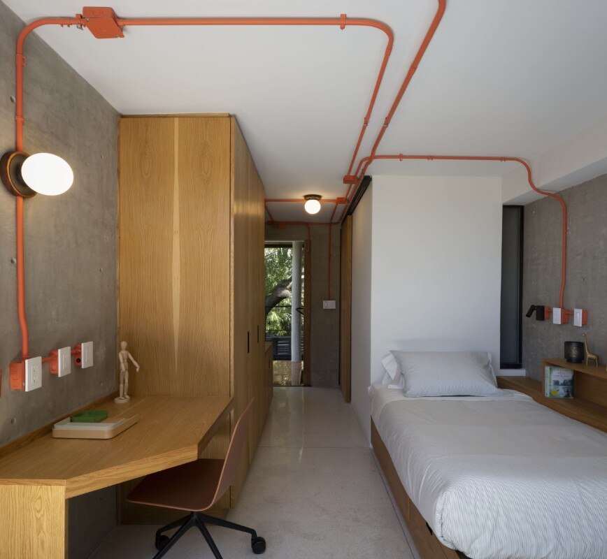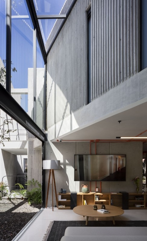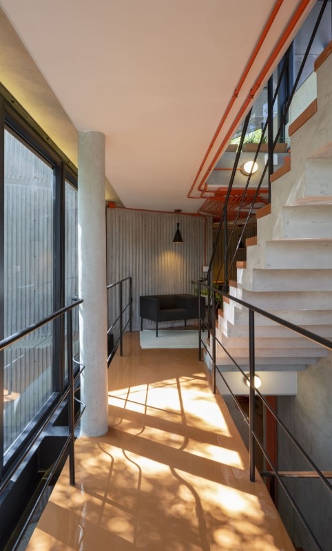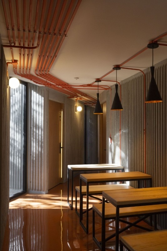 The definition of the interiors is the result of a careful study of the spaces and the expressive combination of materials. A-001 Taller de Arquitectura's choice is to play with the graphic line and tactile quality of the horizontal and vertical surfaces sothat the smooth, shiny resin floor is juxtaposed with the rough walls of corrugated cement and the warm texture of the fixed furniture shape the rooms and create new pathways.