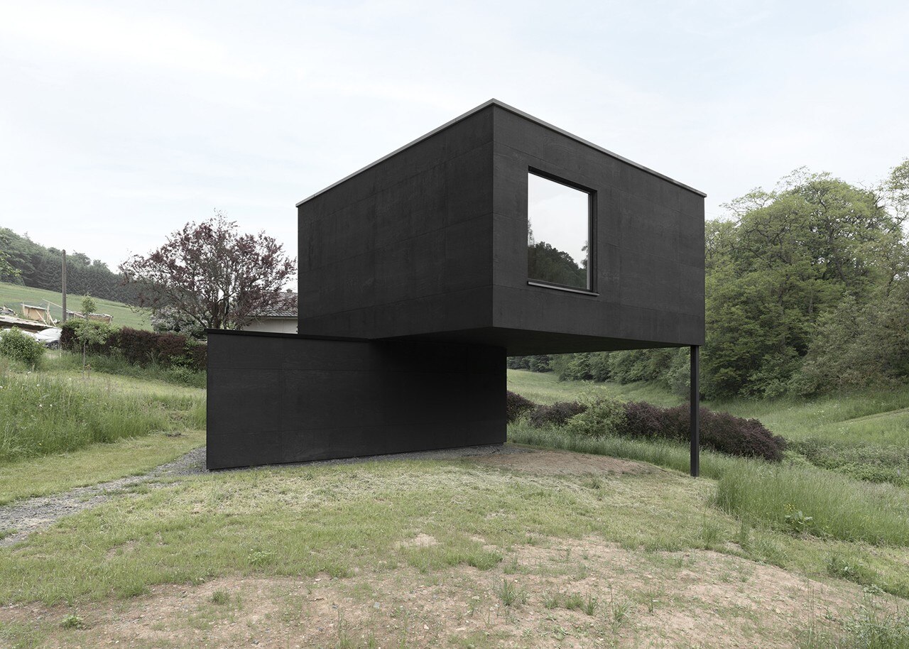 The first habitable sculpture made in this area is the House With Clear Shapes And A Complex Entrance, a three-person dwelling formed volumetrically by the superimposition of two elementary volumes, a triangle and a square. The intersection of the geometries generates four elementary functions – entrance, passageway, staircase and living room – which differ from each other in the selection of material, colour and type of lighting.