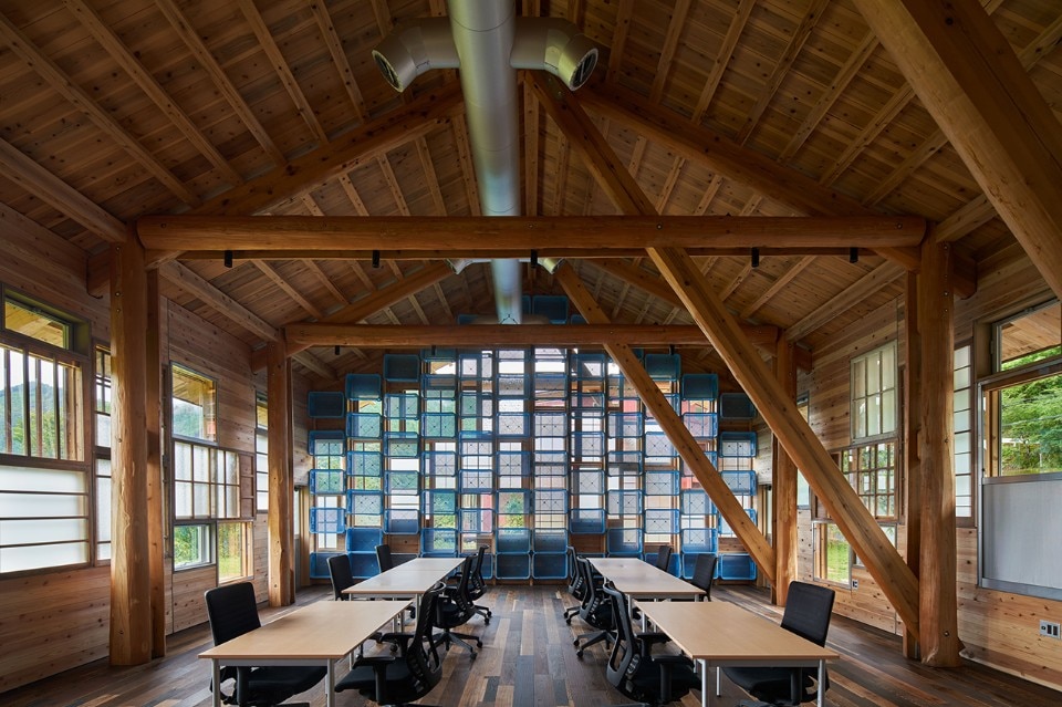 All the building’s components are designed with circularity in mind: bricks, tiles, wooden floors and fabrics were donated by local companies; the furniture was recovered from public buildings and abandoned houses; a large bookcase is made from the crates used to collect shiitake mushrooms.