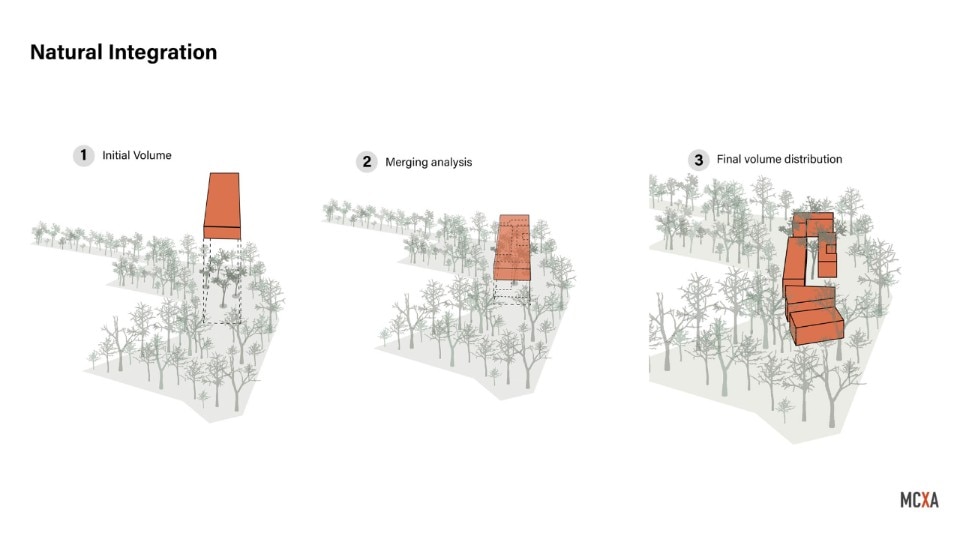 The context, chosen by the clients for the pleasant climate and the enveloping presence of greenery, welcomes the built work that integrates into the site with the utmost delicacy so as not to disturb the existing balance: the volume is inserted in such a way as to avoid compromising the trees in any way, moving back and distributing itself in the free space between them.