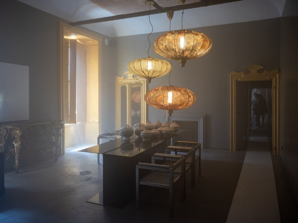 The space is suspended, pervaded by mist, and in the various rooms the new furnishings with white fabrics are on display. The visitor’s path is guided by the points of light, the Belle de Jour table lamps, the Oriente chandeliers and the Abatjour lamp on the floor, concrete, carpet and linoleum. The Parallelo and Millepiedi tables and the Rationalist chairs seem ready for use. As a background, the music of a record player