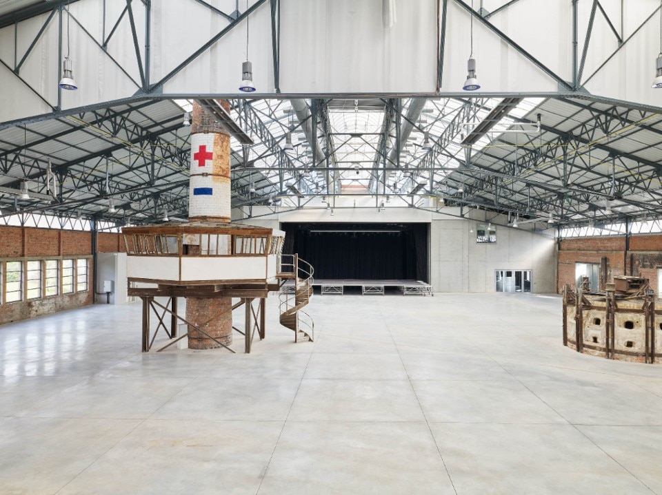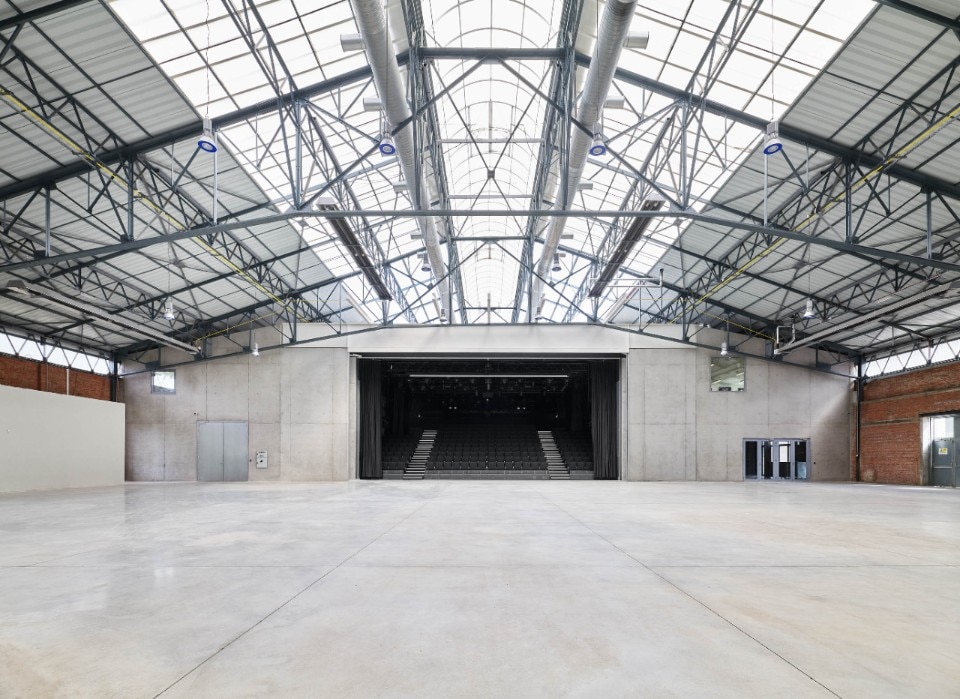 It is decorated with highly varied textures that nonetheless avoid clashing with its older or more recent surfaces: the rough brick walls, the glittering metal doors and roof trusses, and the smooth, anisotropic concrete floor. This monumental hall fully represents an approach that is respectful of the historical heritage, but also confident of the contemporary project’s ability to endow it with new and future-oriented meanings and functions.