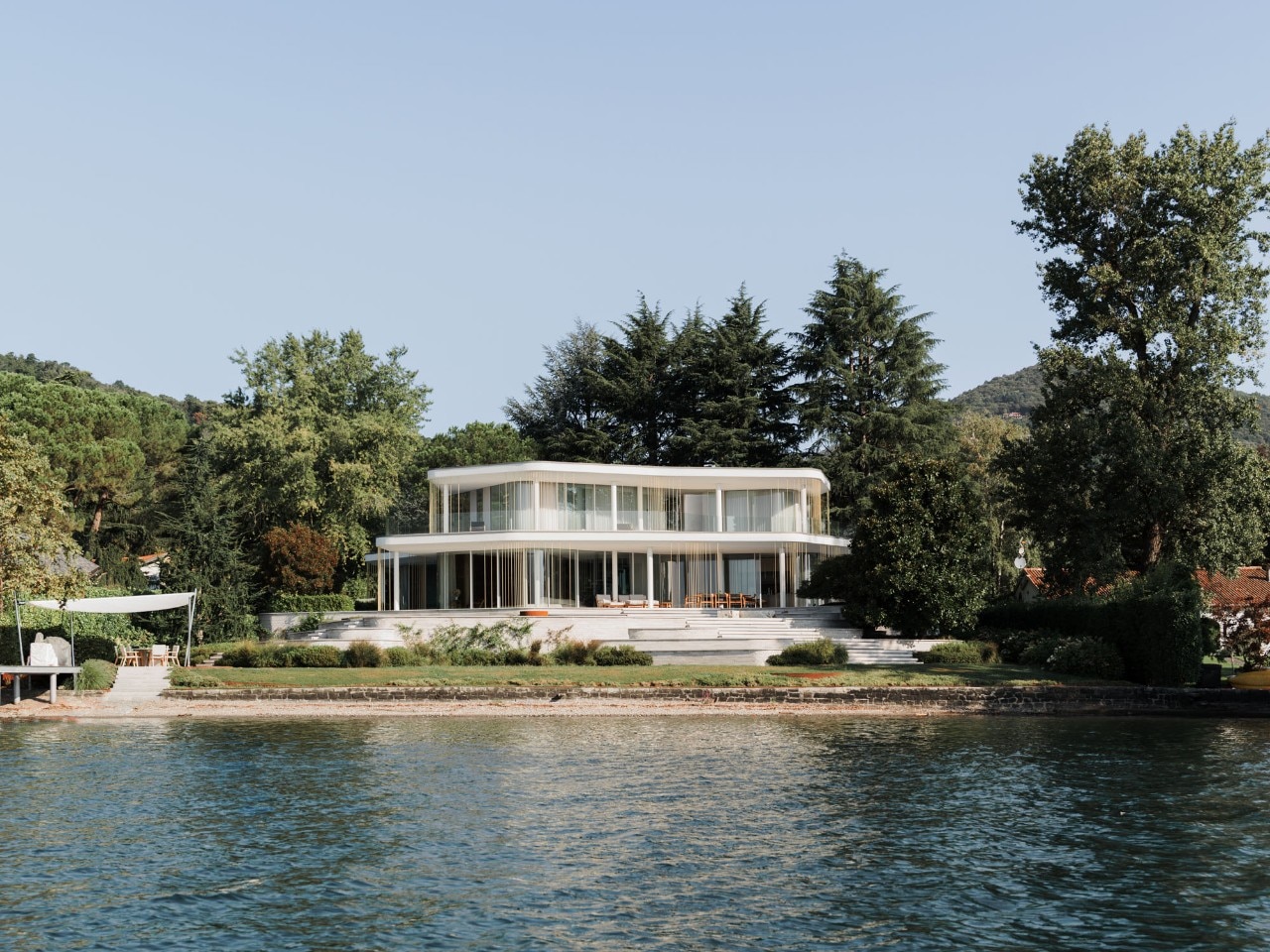 The two-storey building is characterised by a cruciform layout around a two-level central courtyard. The ground floor houses a living room with a breathtaking view of the lake, a kitchen, a study and guest rooms: the punctiform structure allows a free and flexible floor plan, thanks to which the common areas are in a reciprocal perceptive and functional relationship. The upper floor, accessed by an aerial staircase, includes the private rooms with related services and loggias with translucent glass parapets that project the living space outwards.