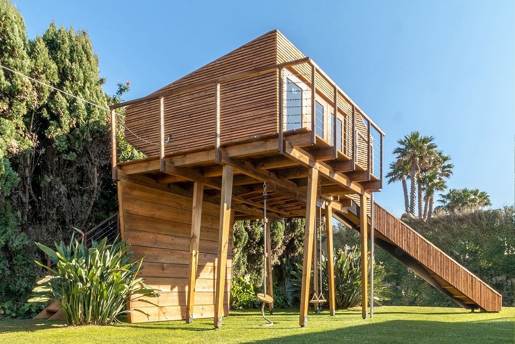 The tiny work is located in a treeless garden near Cascais but, just like its counterpart raised houses among the branches, it is an evocative place with minimal environmental impact: invisible from the outside of the property, the house, made entirely of wood, is suspended on pilotis similar to an insect’s legs and anchored to the ground with metal plates. Inside, a multi-level children’s playground, with multiple routes including a slide, swing and climbing wall, offers recreation for the youngest and escape for the oldest.