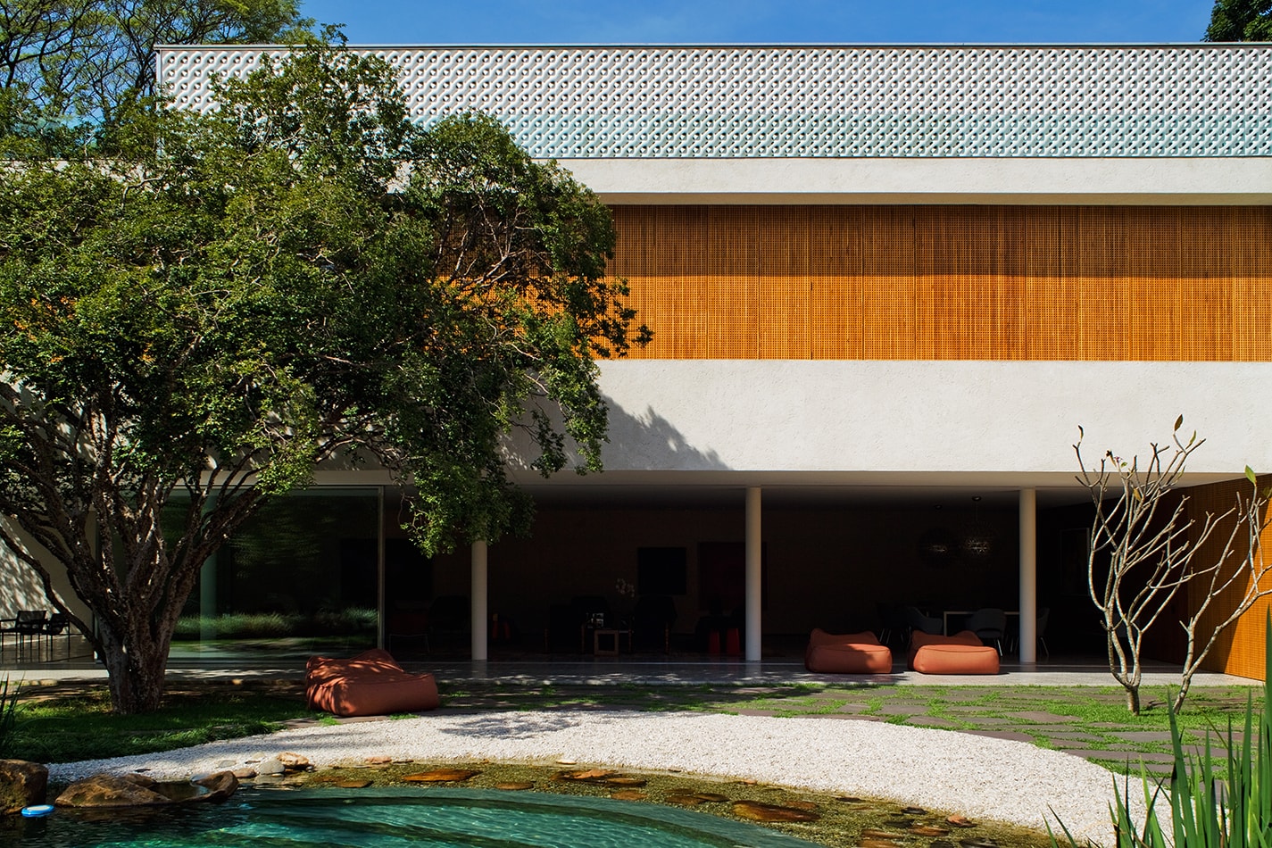 An oasis of calm with modernist suggestions amidst the rich suburban foliage of the metropolis: such is the appearance of this villa with a free floor plan and full-bodied, squared-off volumes in exposed concrete, set in a lush garden. The external wooden screen, inspired by traditional cobogó motifs, envelops the upper levels, filtering light and views and facilitating natural ventilation.