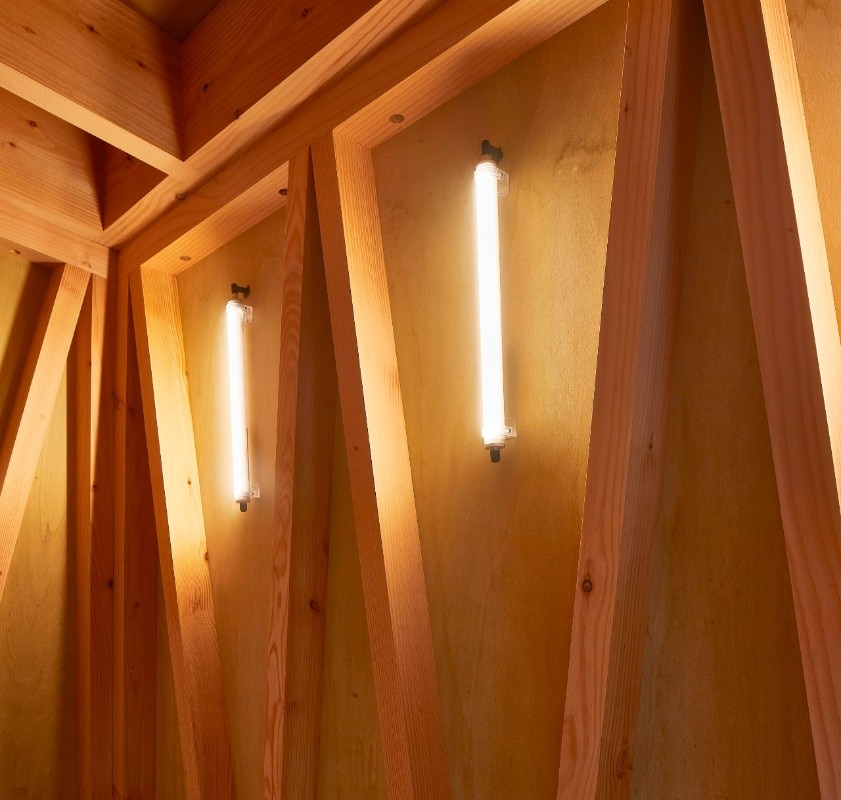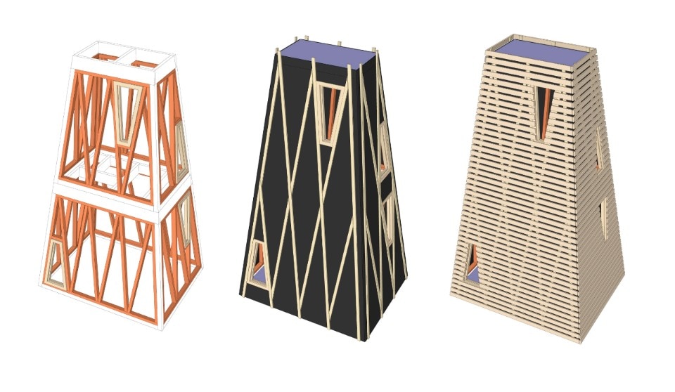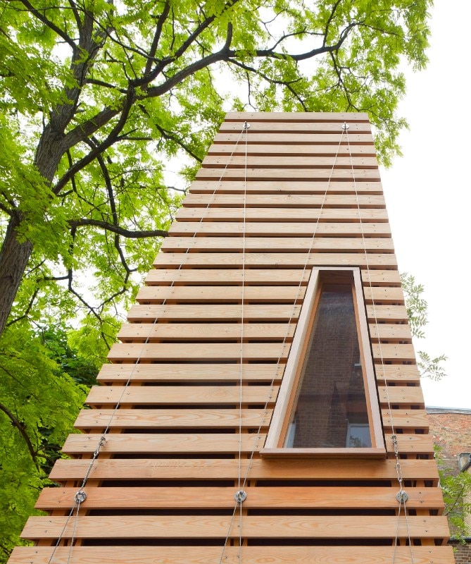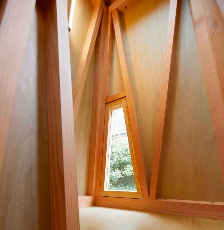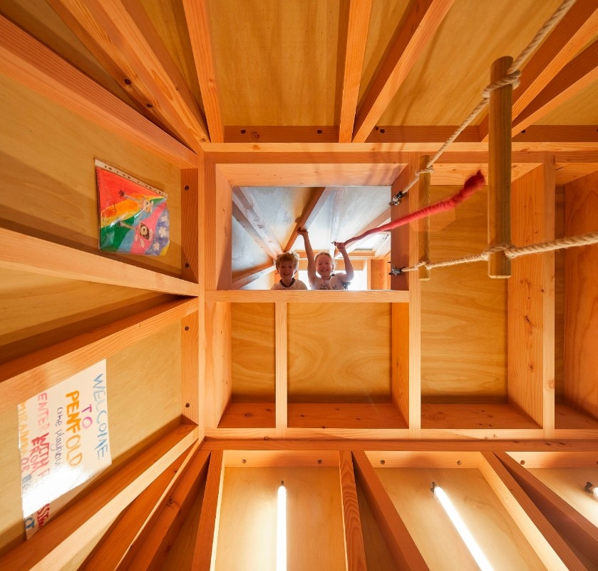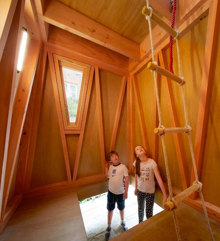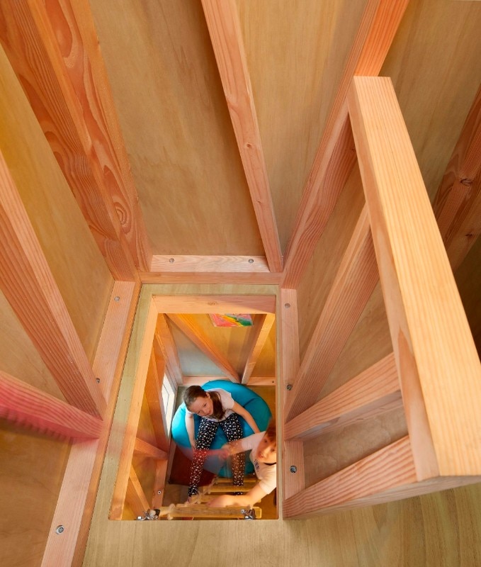 The architects devised a prefab structure composed of a series of triangular Douglas fir frames, measuring 4.1 metres tall in total and shaped like a truncated pyramid. The project was designed with the clients’ children starting from a key concept: to make a den that kids could access more easily than adults, with a lookout at the top. “The unusual form and abstract scale of the structure provides a platform for imaginative play and permissive exploration,” explain the designers. While the entrance is a low portal that one must stoop under and crawl into the structure, the inside is spacious, tall and empty, and the levels are connected by a ladder in wood and rope.