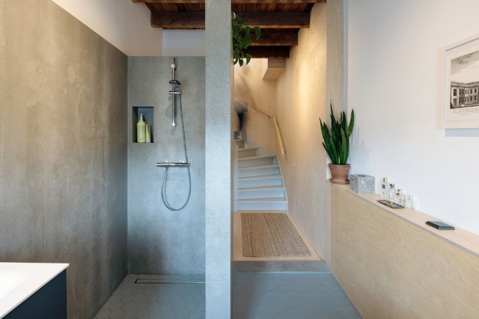 The space on the second floor that had become available has undergone renovation with the removal of the ceiling, the recovery of the original wooden beams and the creation of a new bathroom with a warm, material finish, with birch plywood walls and cement and ceramic cladding.