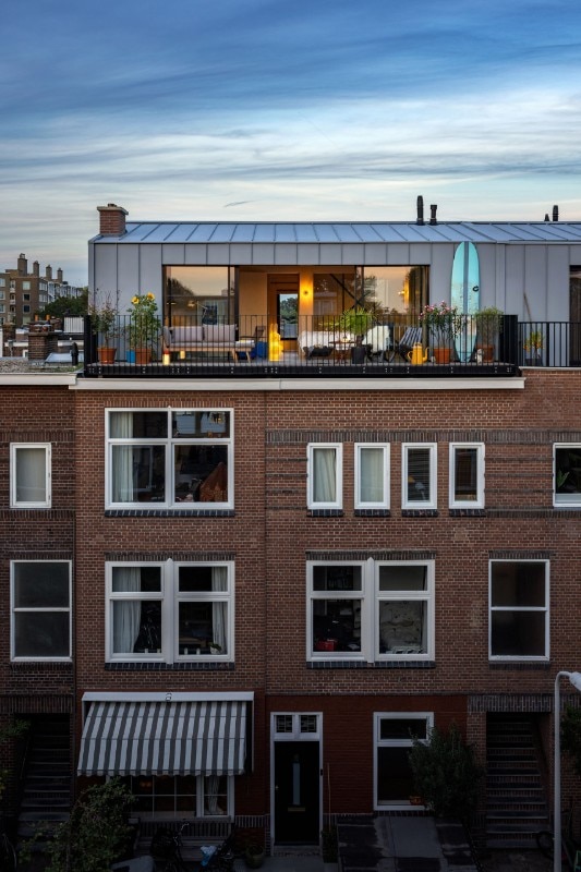 The densely built context, characterised by adjacent three-storey blocks, allowed for the extension to be realized only at the top of the roof, where the new building is clearly recognisable: a gabled volume, set back from the street fronts and entirely clad in steel, creates a lively contrast with the neighbouring buildings with their flat roofs and exposed brickwork. In order to promote a general harmonization to the urban context by means of a unified and coherent linguistic code throughout the neighbourhood, the municipality determined that the first extension on the roof should be the “guiding principle” for the rest of the block: the project therefore envisages the possibility of replication with continuity in the neighbouring buildings as well.