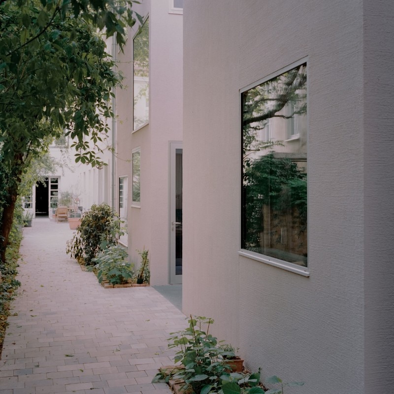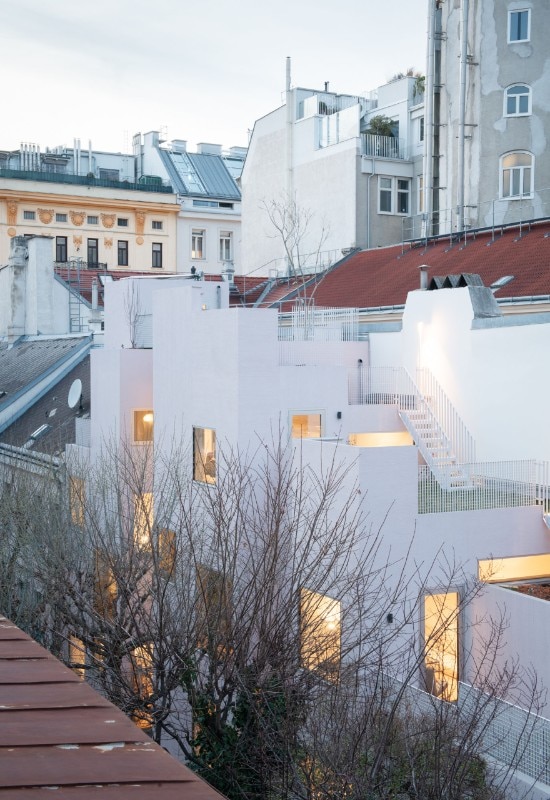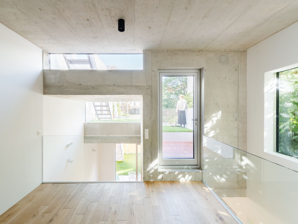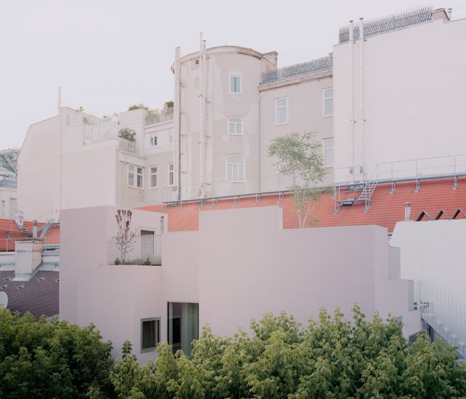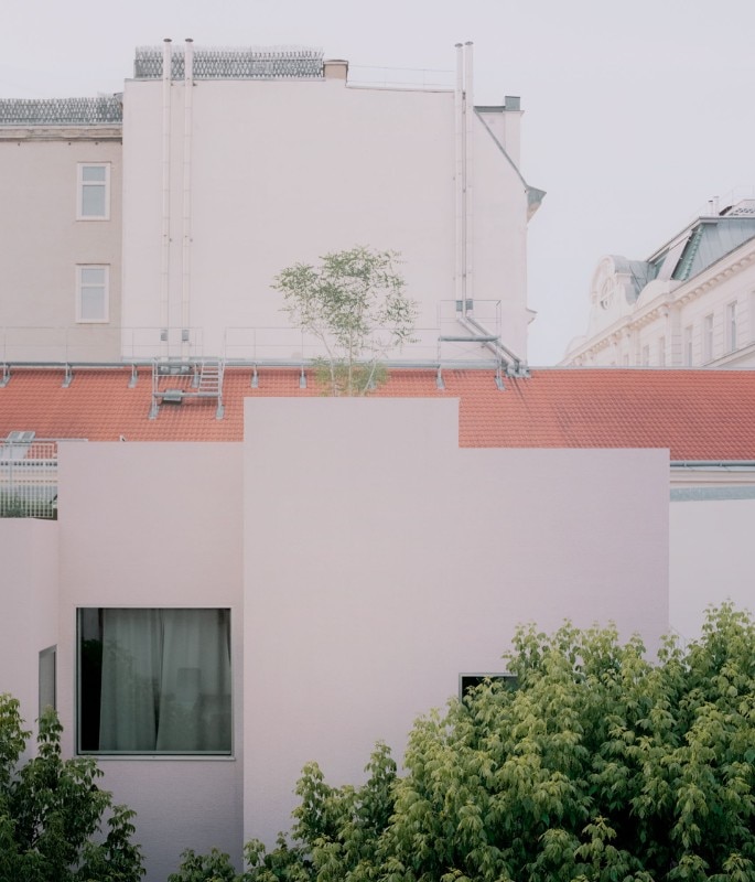 This house, literally wedged into a long, narrow plot – 7m wide and 70m deep –, among warehouses and workshops partially converted into residences in Neubau, a dense and historic neighbourhood in Vienna's 7th district, looks willing to break free from the surrounding built fabric, peeping out among the buildings in search of sky and greenery.