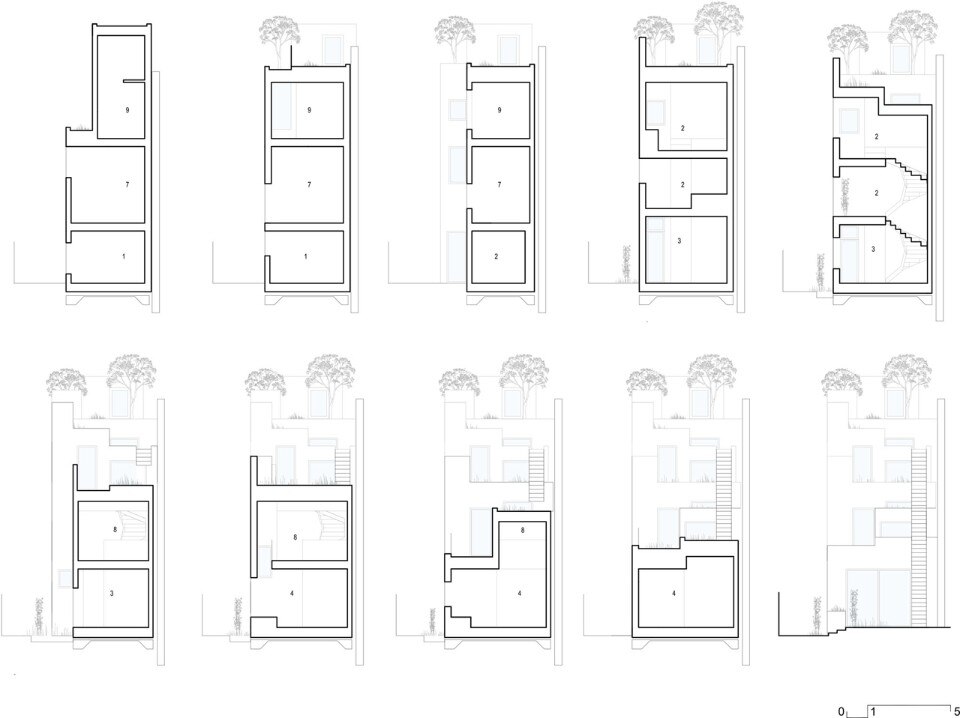 The elongated building is in fact conceived as a hybrid: a house-garden that, unable to reach and use the wide open spaces of a typical suburban area – as it has to deal with the physical constraints of the context – finds them on the roof, among hanging gardens and planted paths.
