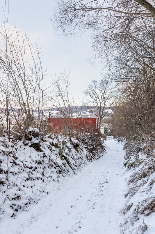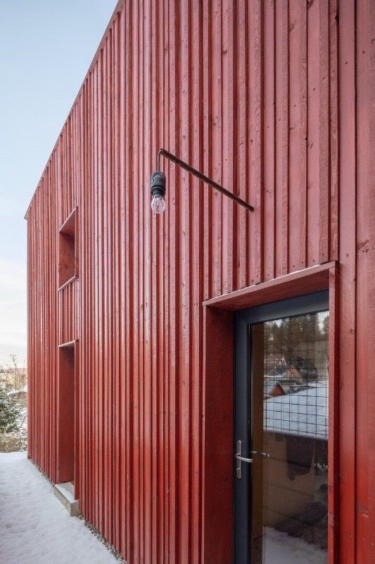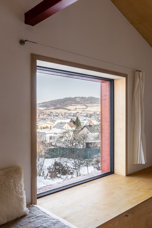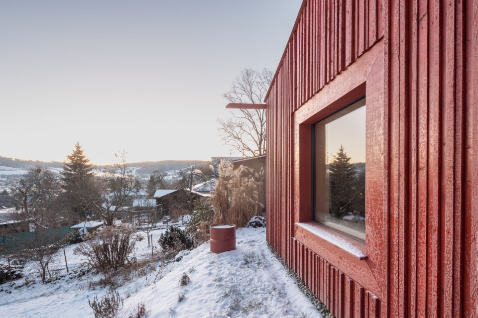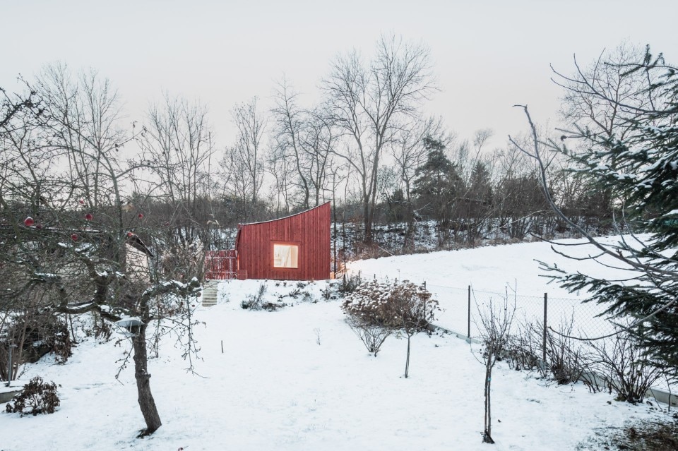 Designed as a place of recreation in Sušice, Czech Republic, cabin above the town is a house located on a sloping plot on the border between the town and the countryside. The 35 square metre dwelling designed by BYRÓ architekti observes the panorama of the Šumava mountains and is characterised by a facade made of reddish wood slats, a shade used for gates and local structures.
