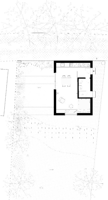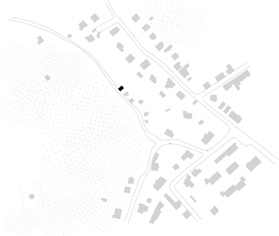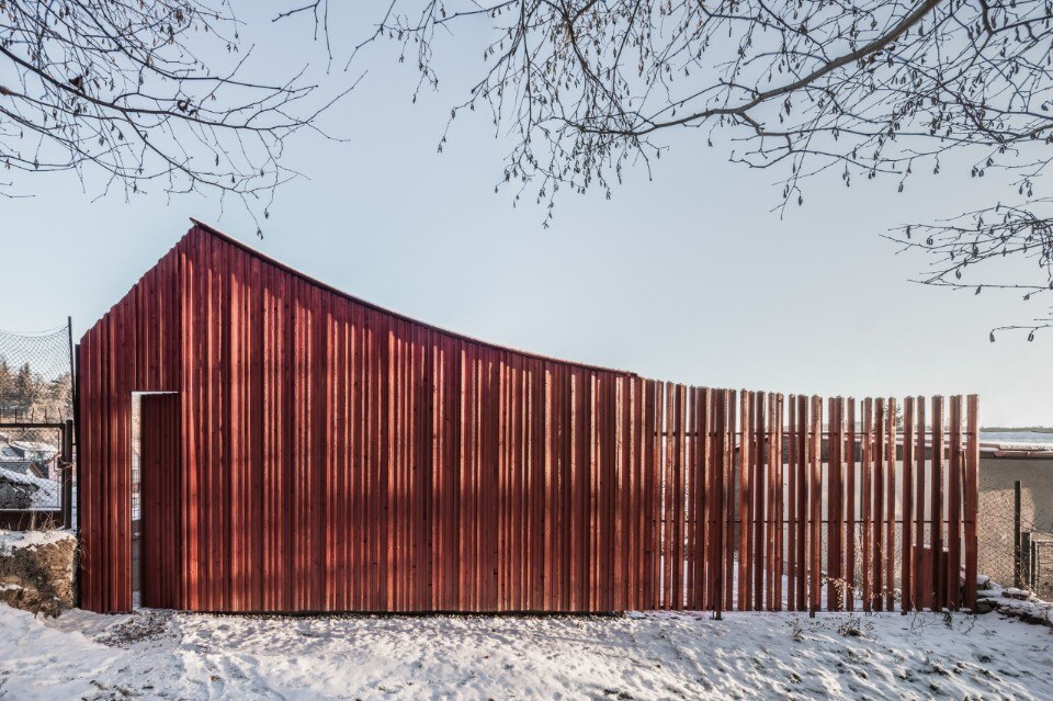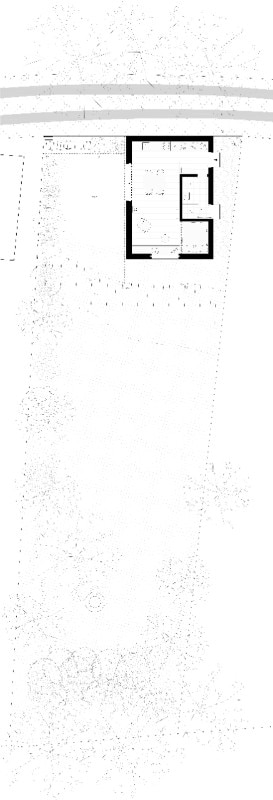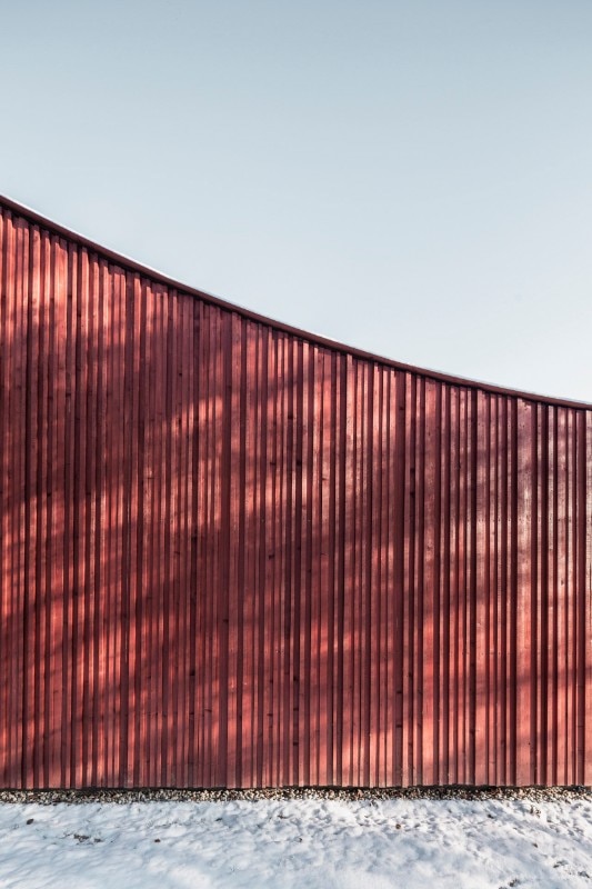 The volume, discrete and compact, seems to disintegrate as one proceeds outwards: the slats of the facade increase their distance and turn into a fence, which screens off the courtyard but at the same time allows views of the landscape. A characteristic feature of the project is the curved roof, a prefabricated element that the studio chose because it was economically viable. Its curvature, when observed from the garden or from a great distance, follows the line of the horizon, thus entering into symbiosis with nature.