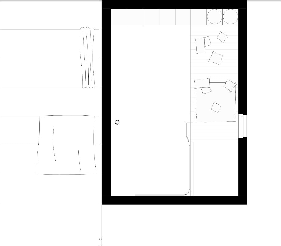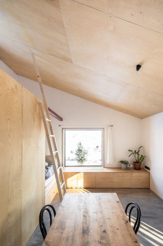 A wooden block was placed in the room to house the bathroom and to divide living and sleeping areas. A raised space with a sloping ceiling serves instead as a guest room.