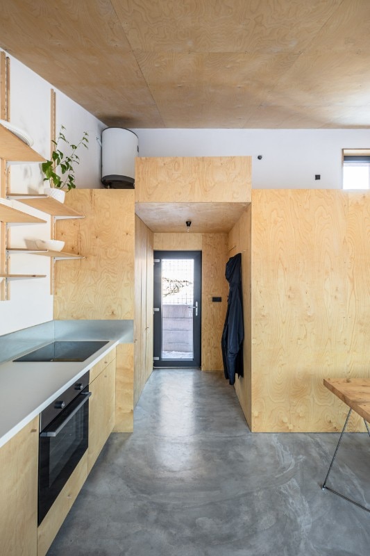 Central was the selection of low-cost materials for the entire project: while on the outside slats are the protagonists, inside there is a concrete floor, plastic windows, plywood walls and an industrial rubber bathroom floor. The furnishings, customised and produced mainly in laminate, are designed to allow a functional space even if it is restricted.