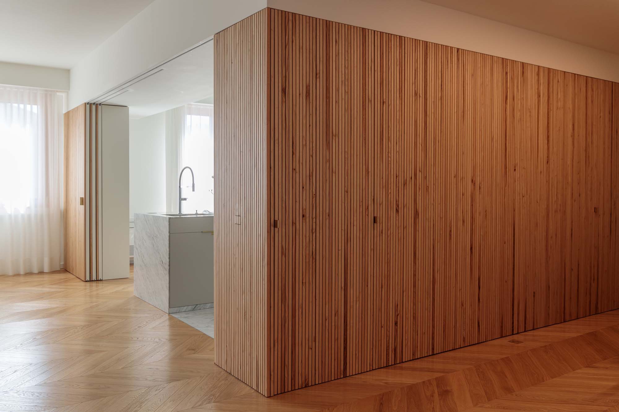 The project envisaged a clear yet articulated functional programme, with the creation of a welcoming entrance area and a large living area overlooked by the kitchen, the inclusion of a new guest room, an additional bathroom and functional storage and distribution spaces. The structural frame of reinforced concrete beams and pillars, with simple infill walls, allowed for radical intervention on the internal partitions without altering the structural scheme. A characteristic feature of the project is in fact the replacement of the original partitions in the common areas and corridors with deep cupboards equipped with sliding panels alternately enclosing the rooms or leaving them functionally and visually interconnected, depending on the specific need: these become functional elements that redesign the layout of the home, as well as fundamental support elements for domestic life.