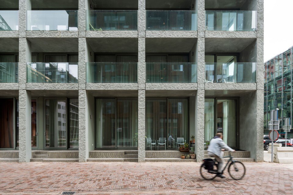 The two main volumes are composed by typologically mixed dwellings. De Gieter presents solidity on the street front and transparency on the internal front establishing a different relationship between opening and closing on the two sides. If in one, indeed, a massive vertical subdivision appears, in the other, the elevation is drawn only by a square modular grid. Both are clad in grey-green precast concrete slabs, kept rough on the outside and smooth on the inside. The geometric rigor is contrasted by the iridescent chiaroscuro effects of sunrays on the coarse surfaces, and by the windows’ reflections.