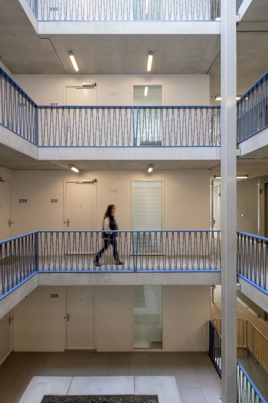 De Slijper’s horizontality and materiality contrast with both De Gieter and the adjacent Werkspoorhal. Here the facades are clad in white tiles against which the blue parapets of the balconies stand out. Inside is a patio in concomitance with the distribution system that homes a tree and connects to the greenery of outdoor spaces. The circulation block identifies the third volume of the complex, emerging against the neighborhood skyline and giving access to a roof terrace. The metal mesh wrapping this structure ensures an outstanding view of the surroundings while adding a character of geometric transparency.