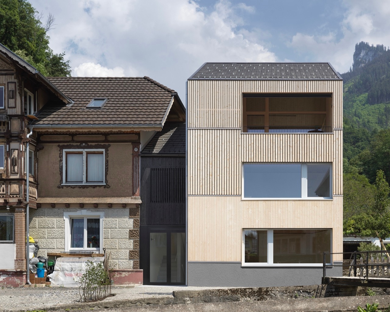 Recently completed, Re-densification in the old quarter is a project in the Alpine region of Vorarlberg, Austria, near the hill on which the Alt-Ems castle ruins stand. Part of a larger programme of redevelopment and densification of the old town centre, the new project designed by Austrian studio MWArchitekten accommodates residential and work spaces in 225 square metres, taking the place of a wooden building that burnt down in 2020.