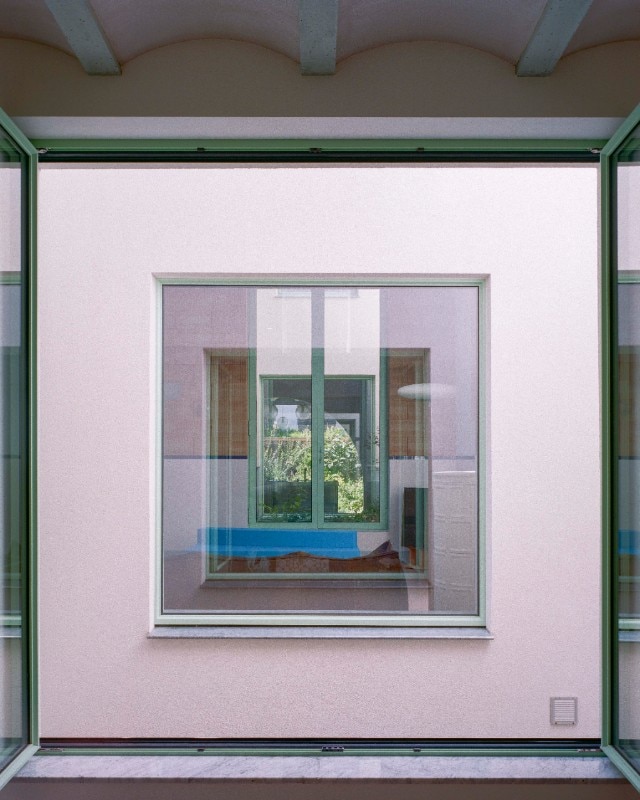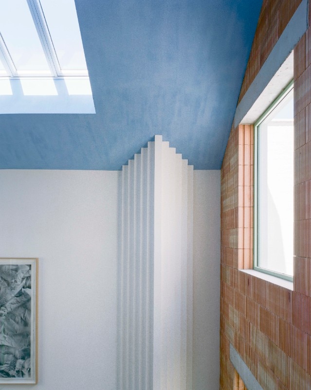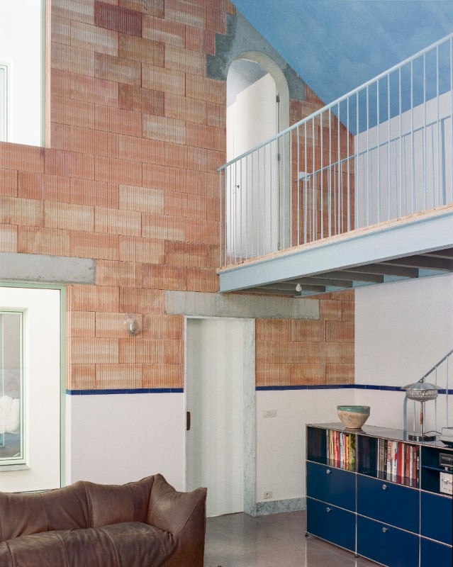 Particular attention has been paid to the choice of materials, some of which belong to the previous building: the terracotta hue of the bricks left exposed interfaces with neutral tones, with the light blues and blues of the furnishings, the plasterwork and the sloping ceiling. The large windows overlooking the patios are also important, helping to maintain an idea of visual continuity between the environments.