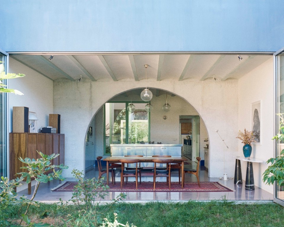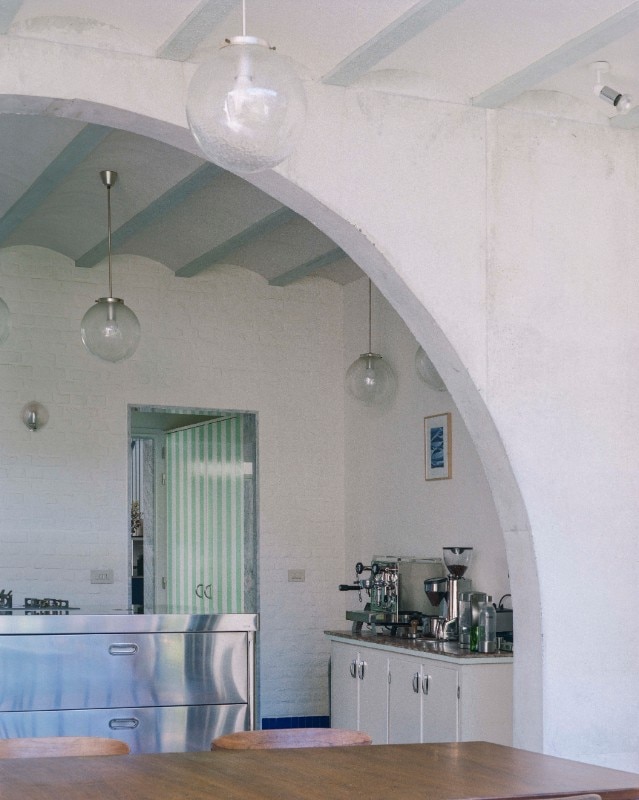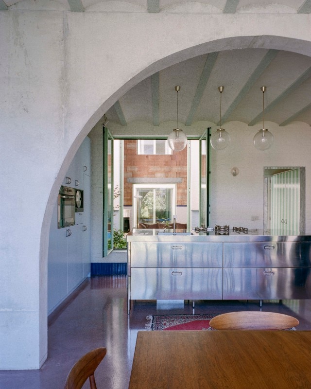 Two patios emerge in this harmonious subdivision, hidden elements of the project but important for connecting the various rooms and offering precious open-air spaces. The volumes, separated by these green corners, are three in total: the first is distributed on three levels while the central one is characterised by the presence of a double-height space in which passages and walkways stitch the architecture together, leading to the adjacent volumes. Finally, the third building is distributed on two levels and is mainly dedicated to the sleeping area. The interiors feature Catalan vaulted ceilings and reveal well-defined, clear, sometimes curvilinear geometric features.