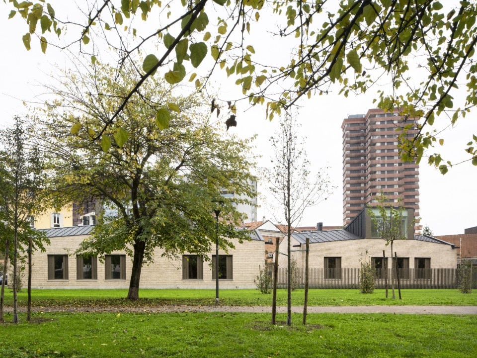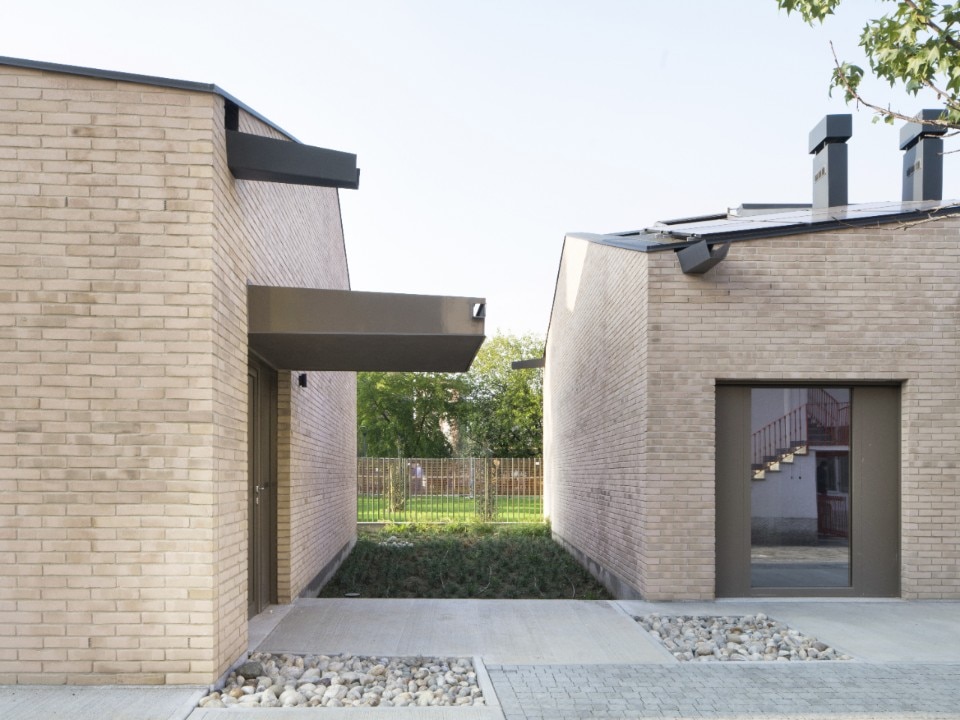 The two northernmost ones are newly built and contain housing units where older parents and their children with learning disabilities can live together while retaining a sense of privacy. The first floor also contains spaces for caregivers with large windows overlooking the landscaped areas. To the south of the site, the entrance pavilion and existing building house two associations with a social vocation and independent accommodation. In addition, the pavilion includes a room with a kitchen workshop open to civic and public activities, a bridge towards the neighbourhood that is reserved for use by residents in the evening. When the light fades, this “discreet landmark” – as Stefano Tropea, founder of B22, describes it – becomes a lantern and “reveals itself to the neighbourhood”.