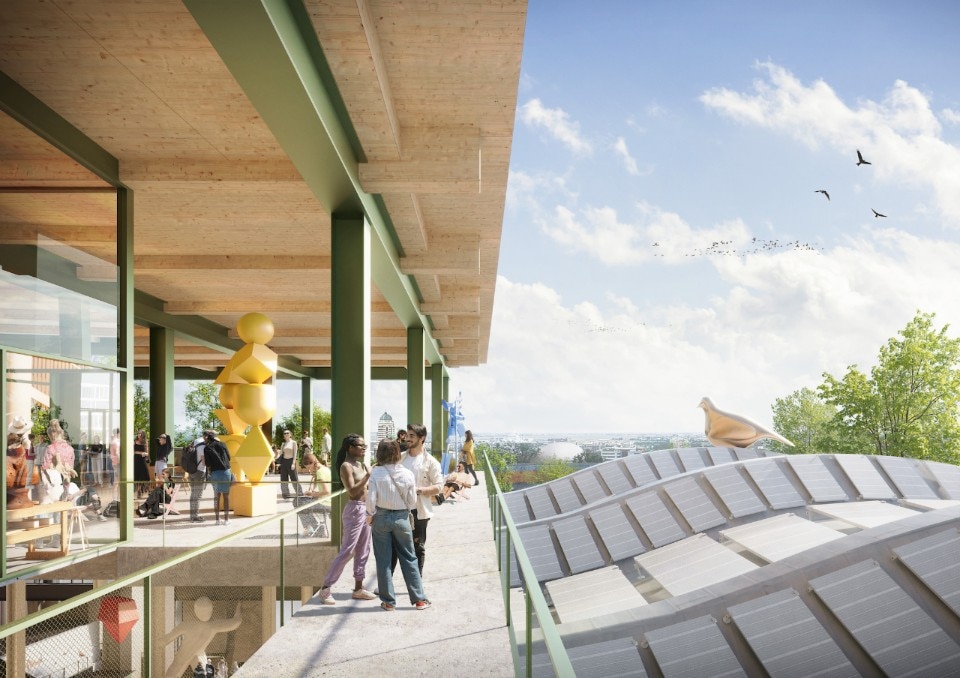 The Dutch firm also designed three mixed-use buildings, with offices on the lower levels and housing above. Clad in brick, these structures reference the pavilion roof with curved lines covering the ground floor windows. The architectures here are located within the green landscape designed by LOLA Landscape Architects-a project in which parts of the public space are returned to nature, in line with the principles of urban rewilding.