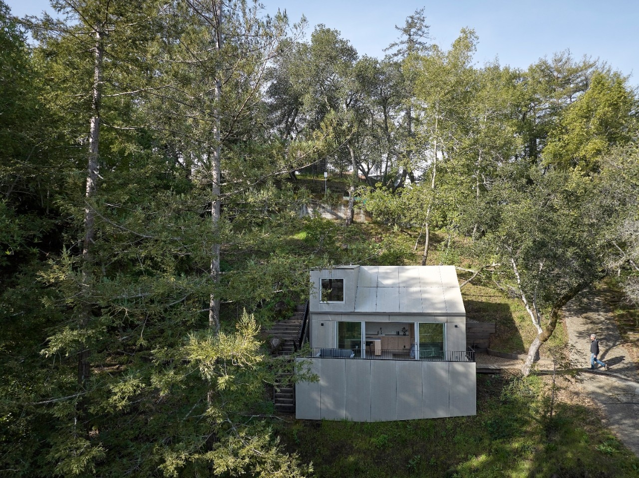 The building, set into the hillside on the south side of the plot, serves as an accessory space for the owners' adjacent dwelling. In order to reduce the ecological footprint and deal with the low budget, the building uses the existing foundations of a demolished garage and is built on two levels, with access from the upper level on the west side. A single-pitch roof with a marked eastward slope follows the course of the ground, expanding into a parallelepiped volume at the south end that corresponds to the small mezzanine entrance area. From here, an almost invisible ladder-staircase leads to the level below, where the dining-kitchen area, with a removable unit, acts as a pivot for domestic life: the sleeping area to the north, with a drop-down bed that disappears into the wall during the day, leaving space for the living room sofa; the services to the south arranged in two micro-cells with bathroom and shower stall with a window overlooking the woods. A panoramic terrace to the east, accessible through a large sliding glass door, expands the outdoor living space given the mild Californian climate, and blurs the boundaries between indoors and outdoors.