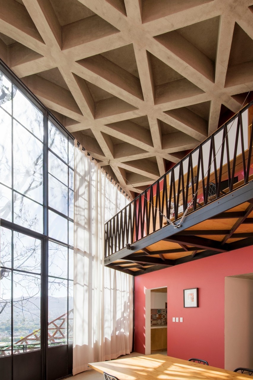 Casa VA, designed by architect Omar López Bautista with his firm ET.co, is located on the Cerro del Fortín hill, within a densely built-up area of complex accessibility. The small and steep plot, with a difference in height of about 12 metres, directed the architect towards a solution with vertical development, which integrates two independent spaces: a small rental flat and a home for the clients. The project revolves around the panoramic view of the city and Monte Alban, seeking to isolate itself from its neighbours and keeping the upper flat area free, through two huajes, native trees from which Oaxaca derives its name.