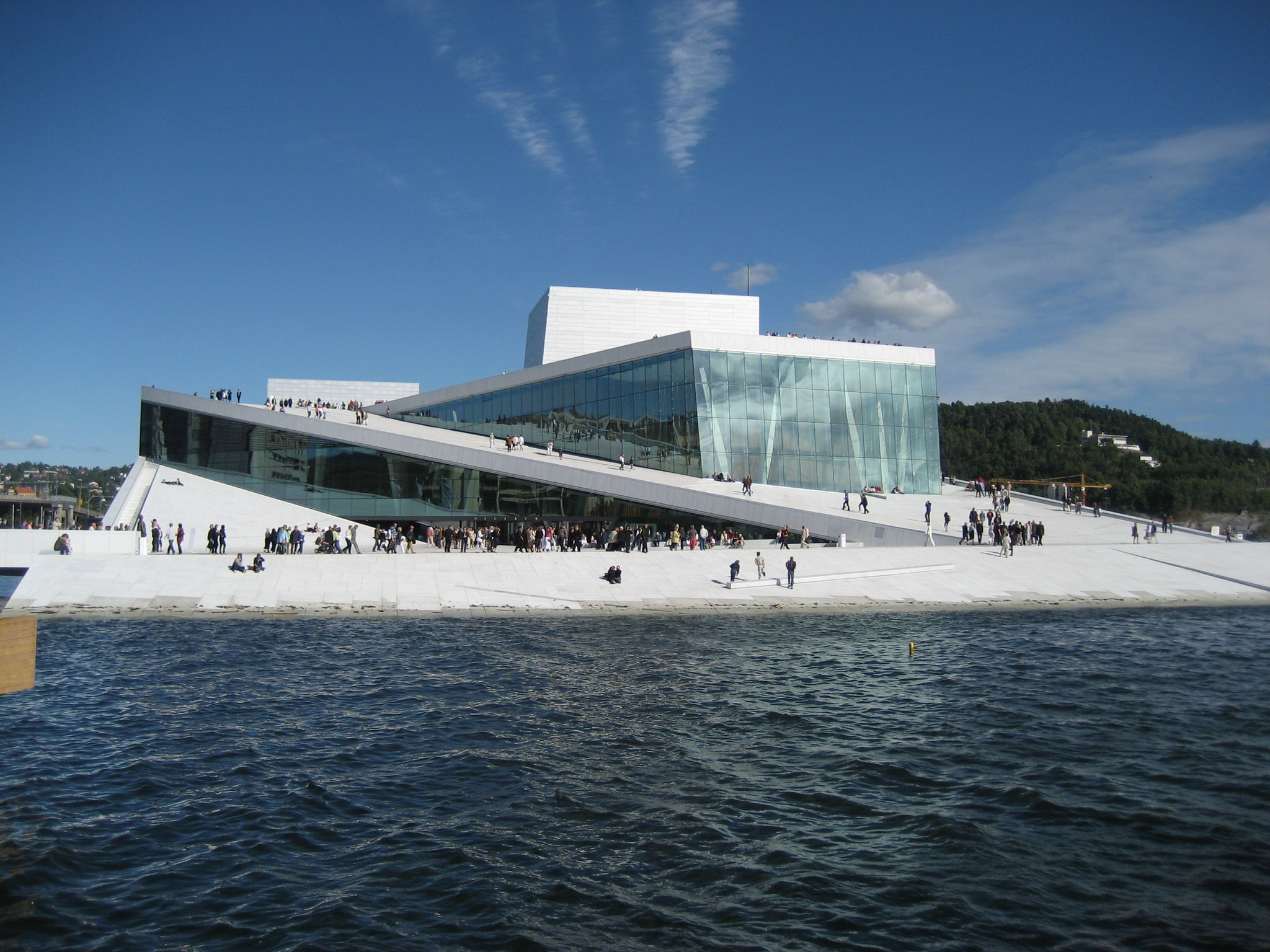 The Opera House complex is an important driver of regeneration in the former port area undergoing transformation of Bjøzvika. The structure clad in Swedish white granite and Carrara marble stands out in the landscape like a monumental iceberg rising out of the fjord and blurring the boundaries between land and water into which it seems to sink, with its sloping roof generating an urban promenade.