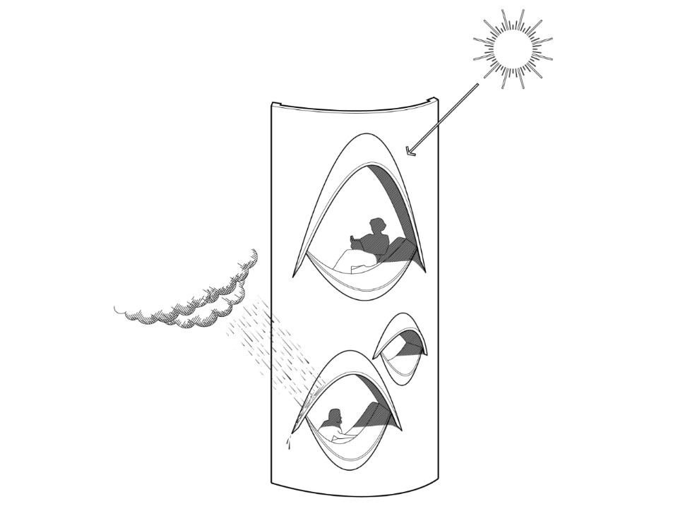 At the base, the "eyes" turn into arches that frame the entrances and create a connection with the surroundings; in elevation, they deform to become full-height openings or to accommodate incorporated seating inside. Special “eyelids” moulded into the concrete protrude according to orientation to protect the glazing from sunlight and channel rainwater.