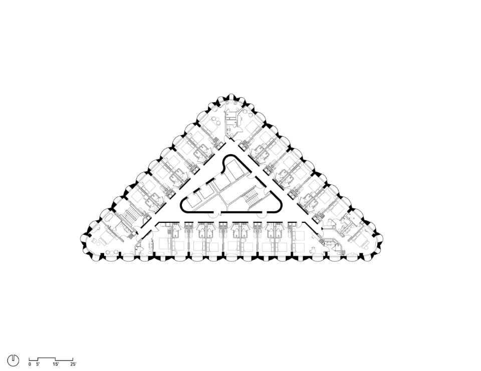 The thirteen-storey tower fits into a triangular plot, in keeping with the rich tradition of flatiron buildings, and includes a double-height lobby, restaurant and coffee shop on the ground floor, a fitness centre and event space on the second floor, 265 rooms from the third to the thirteenth floor, and rooftop spaces for private events and a terrace with restaurant and bar open to the public.The volume is designed to relate in a balanced manner to the neighbouring buildings, eroding at the corner to the top to allow the gaze to capture the cityscape and the mountains from the tables of the rooftop terrace.