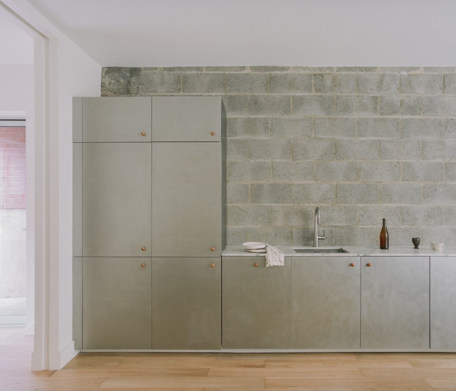 Inside, a palette of a few, selected materials composes warm and enveloping spaces, featuring an obsessive attention to details. The rough exposed concrete block walls (functional to guarantee thermal inertia and insulation) dialogue with the custom-made furniture elements designed by Flawk (including the brushed stainless steel kitchen and dining table) and are figuratively softened by the warm finishes in oak and Douglas fir. The collection of exclusive objects and accessories, commissioned and carefully curated by Flawk, brings a sophistication that reflects the project team's desire to support emerging local design: from handmade curtain rings, to locally sourced fabrics, to hand-carved mirrors.