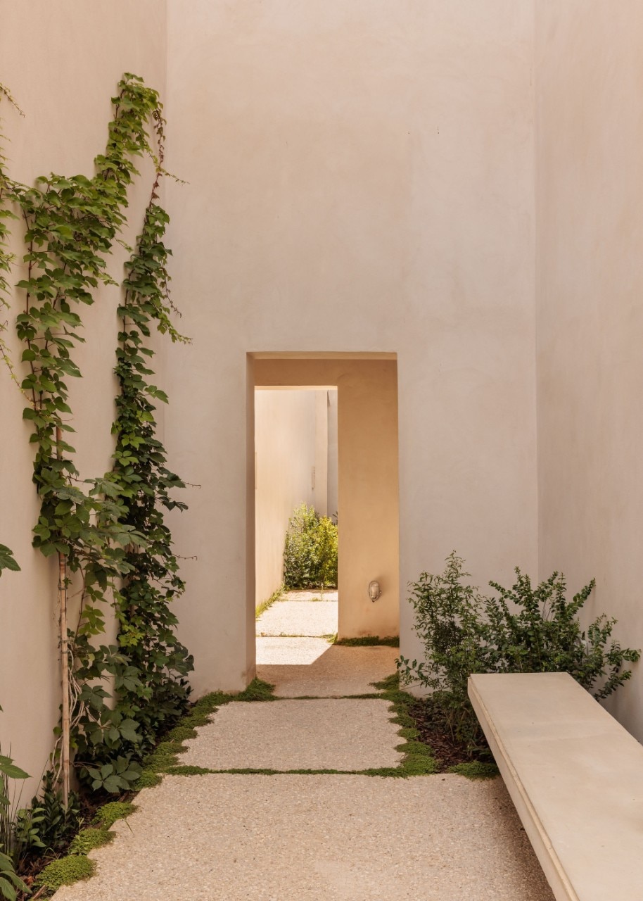 Inside, the warm tones of the floors, seating and walls plastered with slightly sandy cement mortar, on which vegetation stands out, create spatial cohesion and give the environment a serene and pacifying atmosphere.