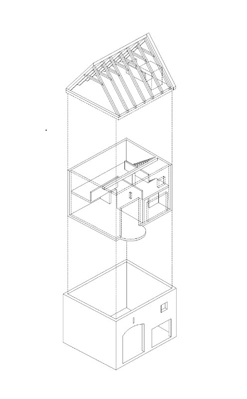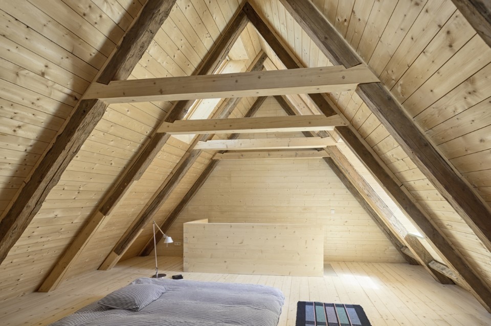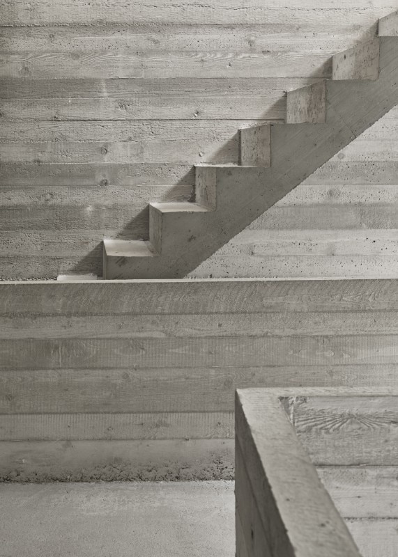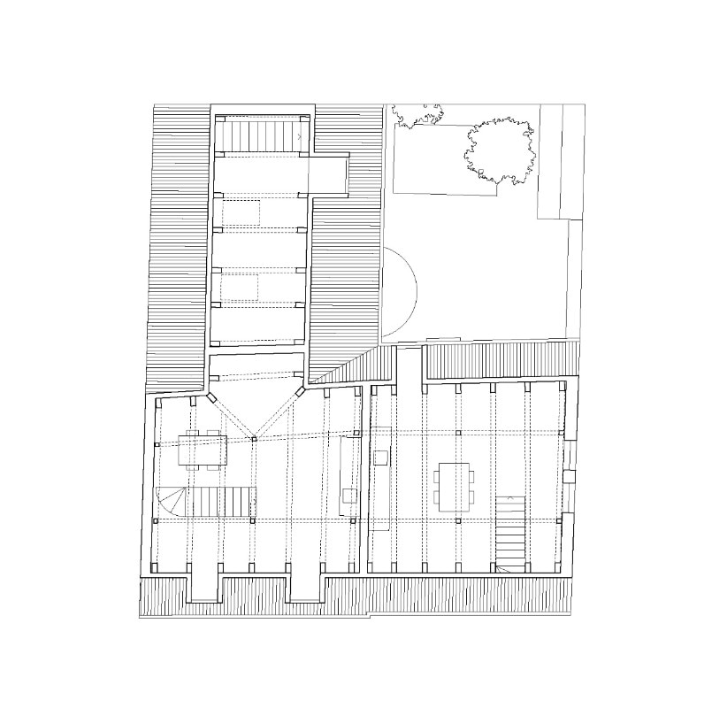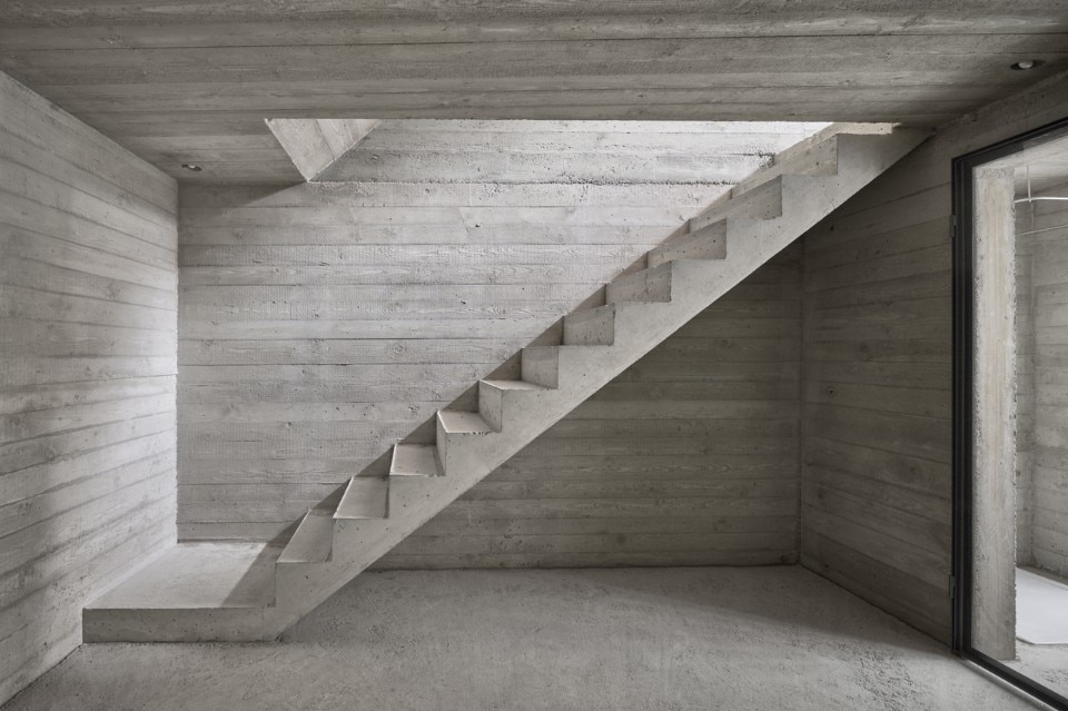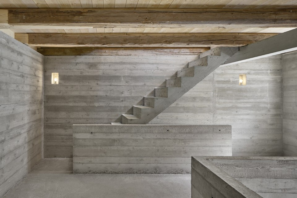 The intervention revolves around a new reinforced concrete structure, cast in specially made formwork, to highlight specific historical elements such as an old wall, or the beautifully restored wooden truss crafted by a local artisan.