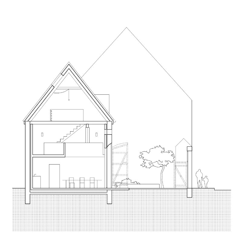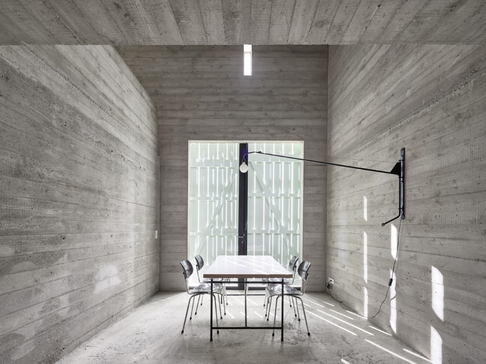On the ground floor, the dining area, also serving as a gallery, is a spacious loft-like space; the double height allows the living area on the upper floor to expand the space and strengthen its connection with the small entrance courtyard.