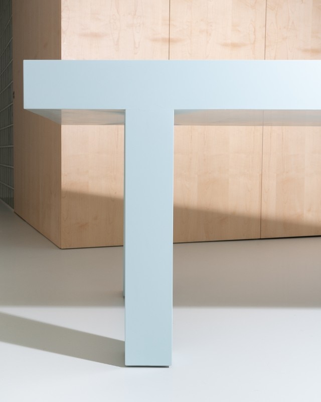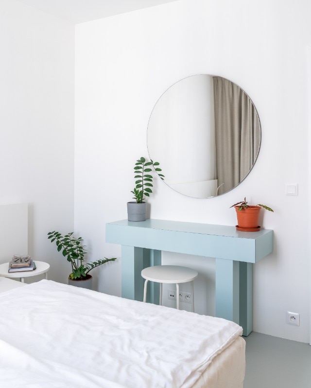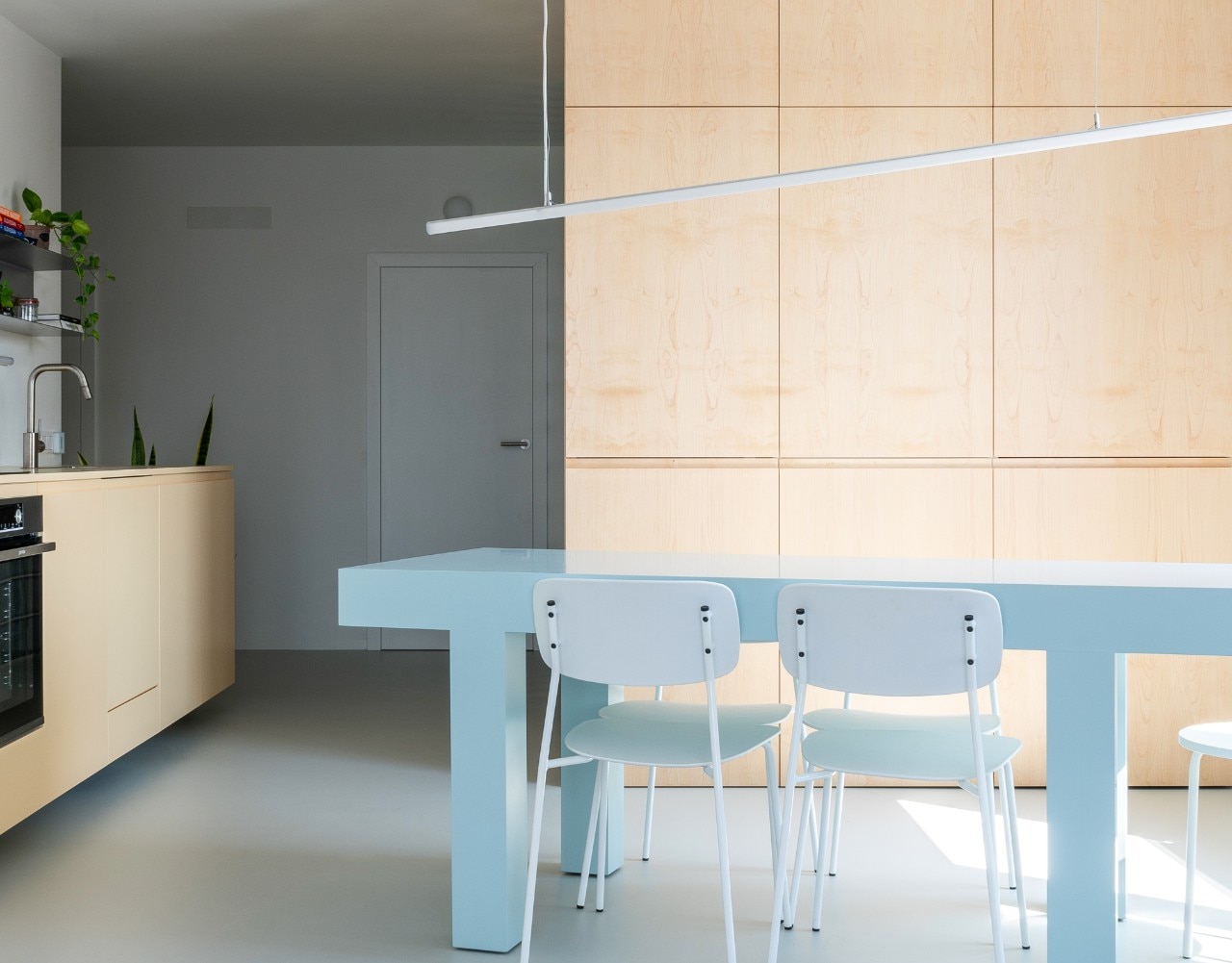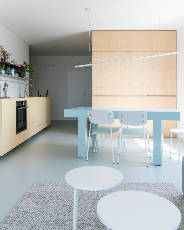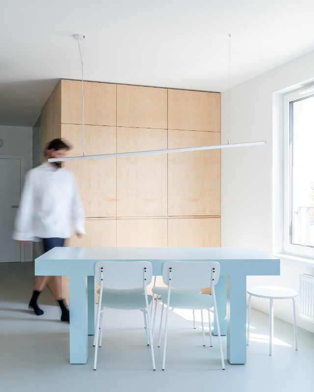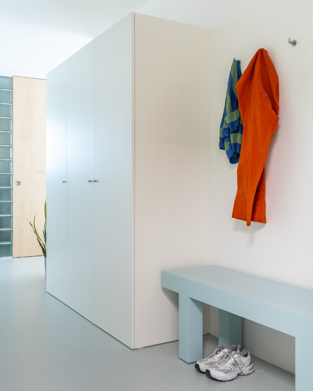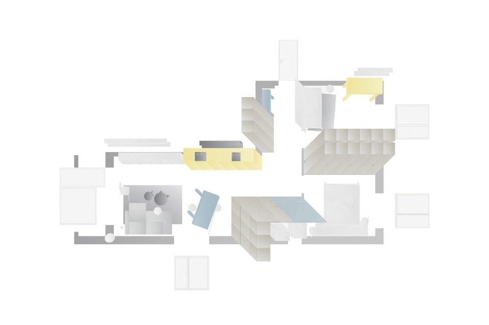 What ultimately unifies the project is its system of color, acting almost like a pastel-toned Centre Pompidou. Each hue corresponds to a specific use: yellow gathers the work zones, such as the kitchen and writing desk; pale blue defines the spaces meant “for staying”, like the dining area and the bench near the entrance; an extremely light-toned veneer identifies all storage elements; while white is reserved for everything that soothes, from shelves and TV walls to bed frames.