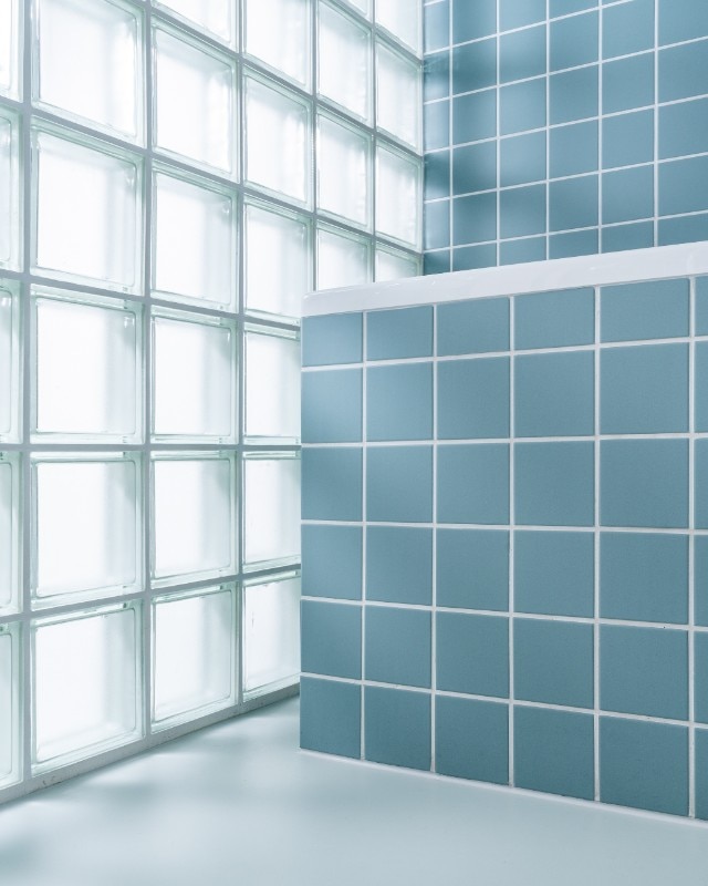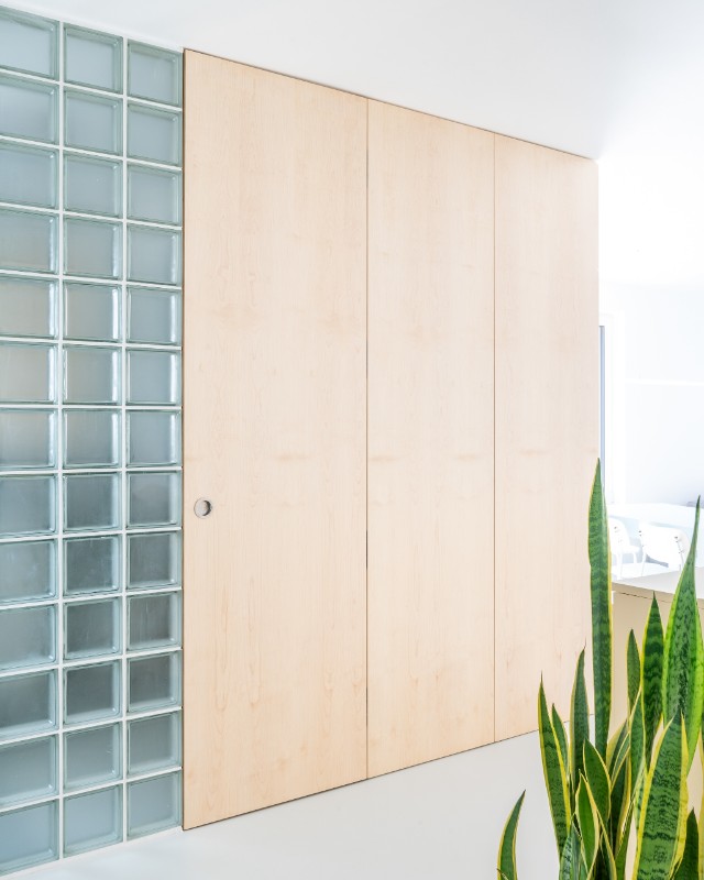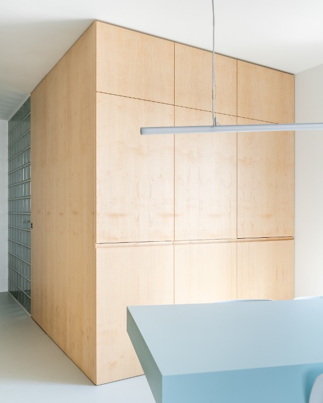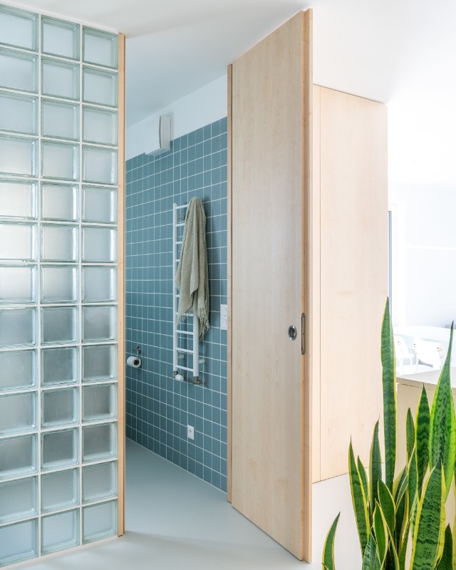 The structural move was to merge the bathroom and toilet into a single volume, creating more breathing room for the living area. The compact, multi-material block – what the architects call a “spatial box” – is made of light wood from the kitchen columns that mark one of its sides, and a wall of glass bricks that introduces a new kind of light into the entrance area.