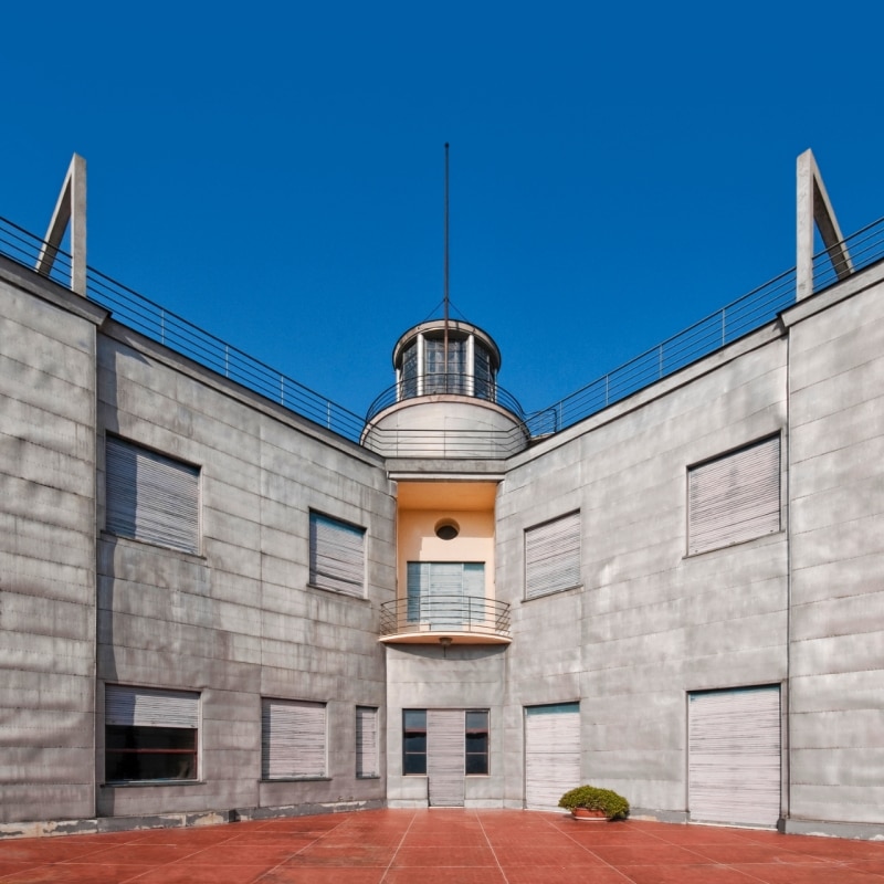 The building consists of a three-story circular basement leaning against the natural slope of the land, on which rests a two-story volume with an “L” layout pivoting on a central cylindrical block including staircase and elevator bodies, and topped by a glass-concrete turret. On the exterior, rigorous rationalist geometries pay homage to nautical architecture through the gleaming, light metal cladding of the facades. Inside, Art Deco atmospheres infused with futurist suggestions pervade the rooms: a large garage and reception rooms in the basement, the family's domestic spaces in the upper volume (with common rooms on the first level and sleeping areas on the second).