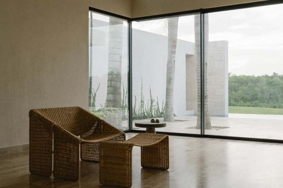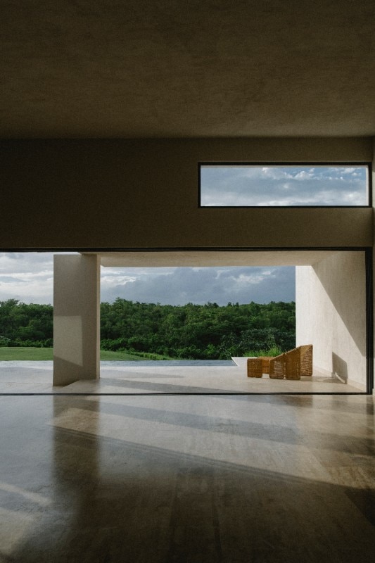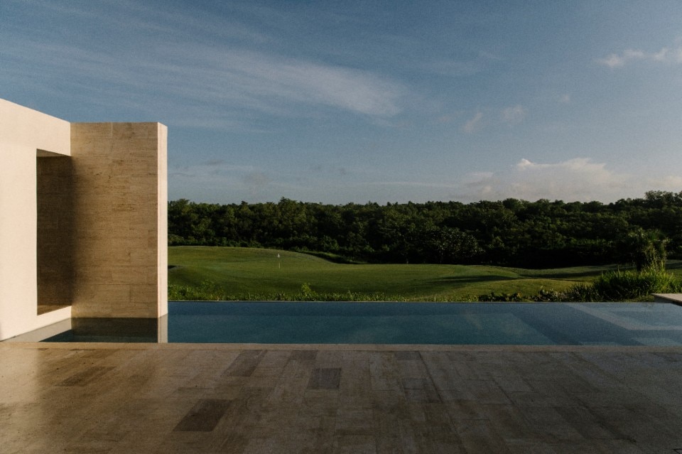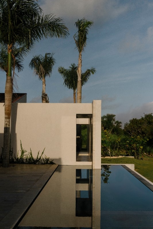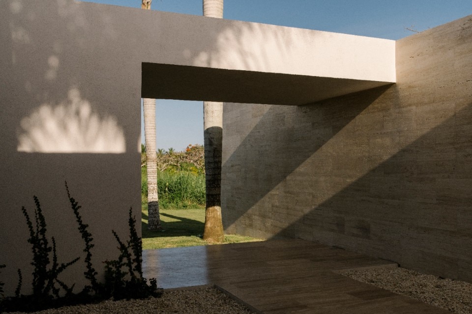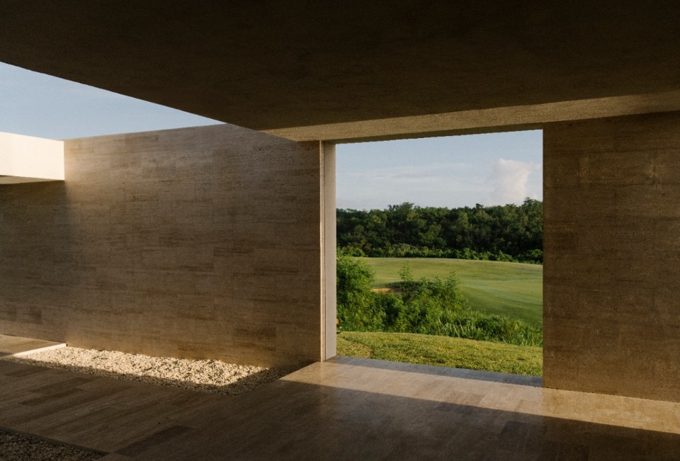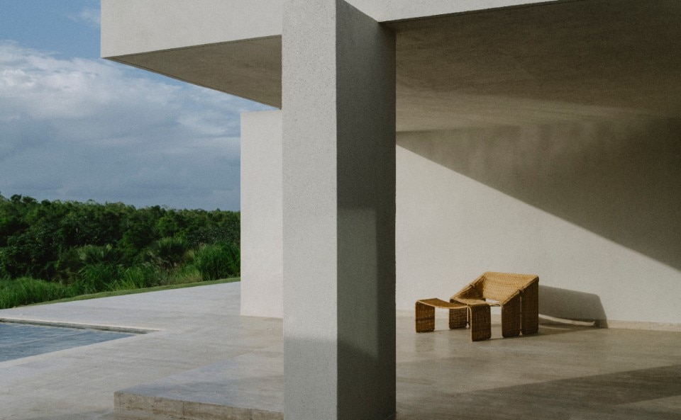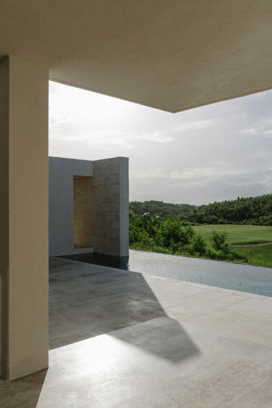 The dialogue between solids and voids, between light and shadow, and the play of reflections on the pool's mirror of water that duplicates the Caribbean sky lend a vaguely "contemplative" character to the composition, accentuated in the interiors – finished with natural materials (stone, wood and plaster) and punctuated by textured furnishings – where a pacifying, rarefied atmosphere reigns.