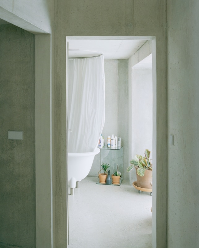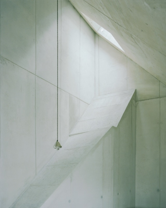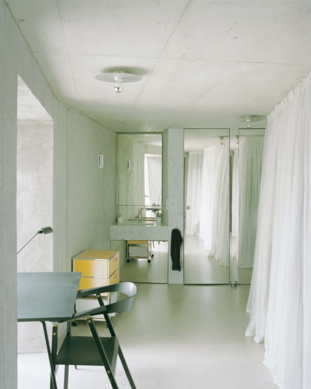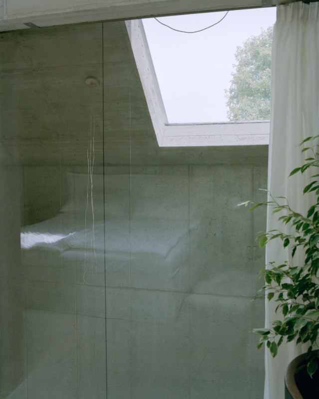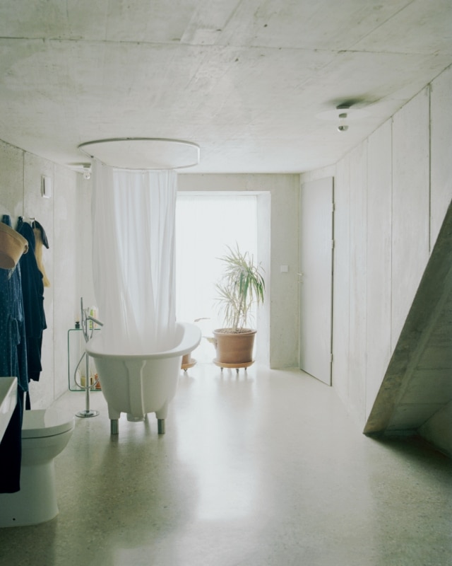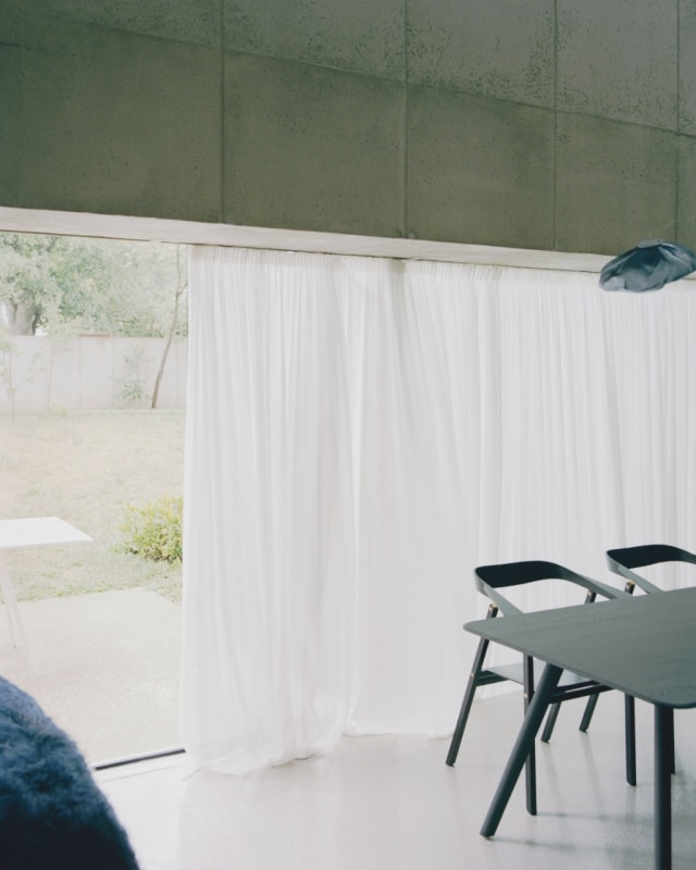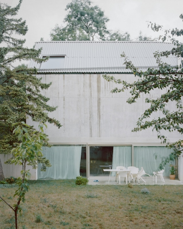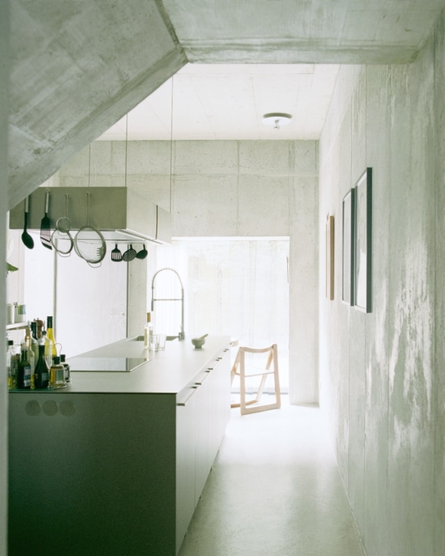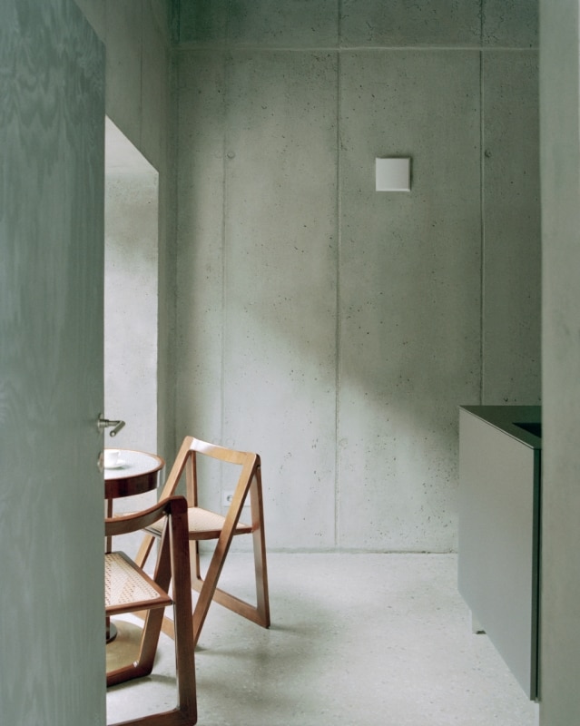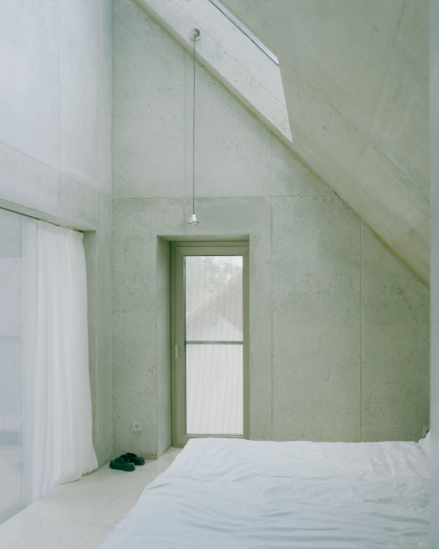 The volume appears as a monolithic mass of reinforced concrete, with an insulation system cast directly into the masonry. The absence of layers and the uniformity of the material give the building an archaic yet innovative character. Walls and floors, made of slender concrete partitions, directly integrate heating and cooling pipes: the house thus becomes a thermoactive body, capable of self-regulation.