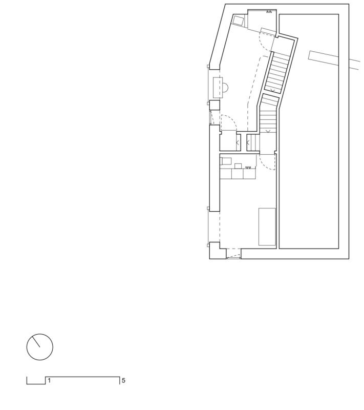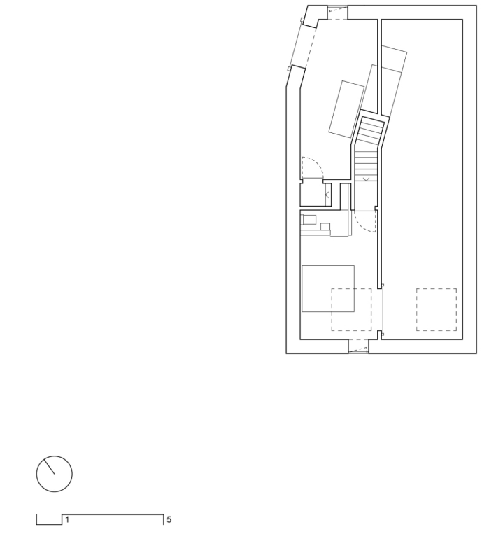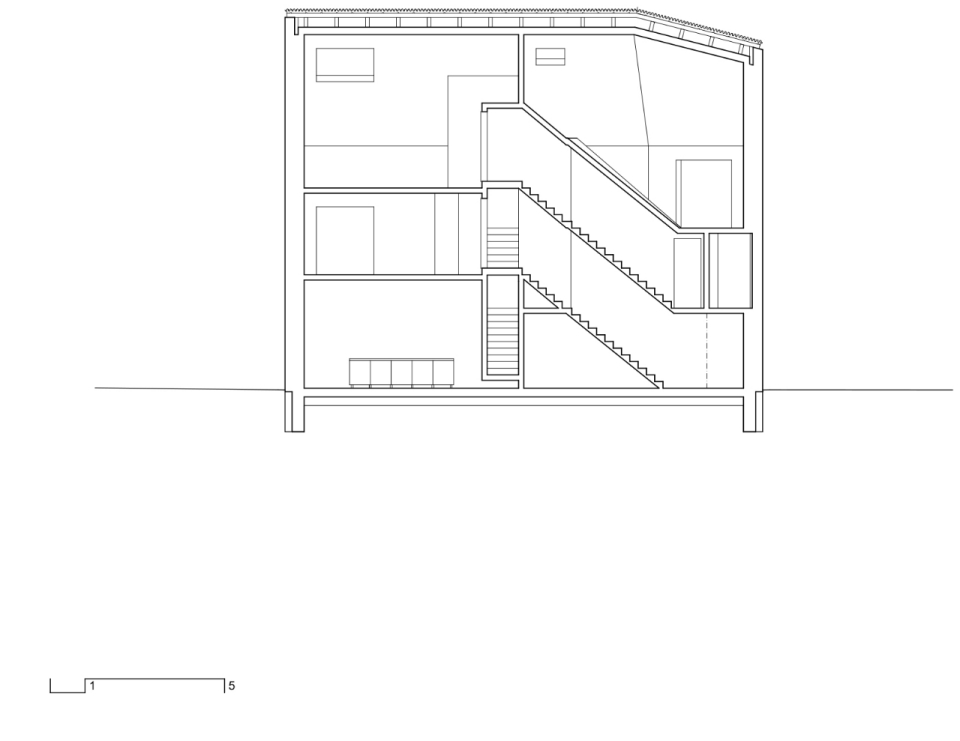 From this crucial space, a system of two overlapping staircases, resembling a double helix, leads to the second half of the dwelling: six rooms spread over three floors, facing the tracks. Identical in surface area, with large windows on the north side and openings for natural ventilation on the opposite side, the rooms gain specificity due to the different heights generated by the difference in height of the stairs.