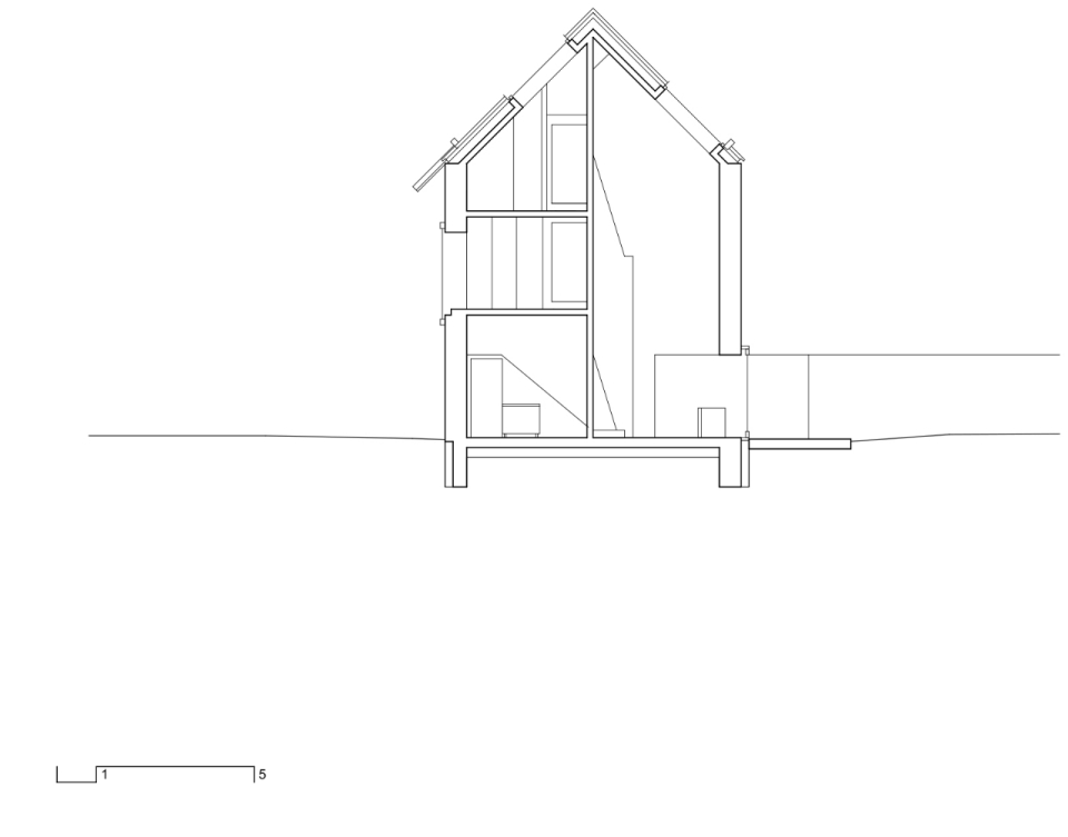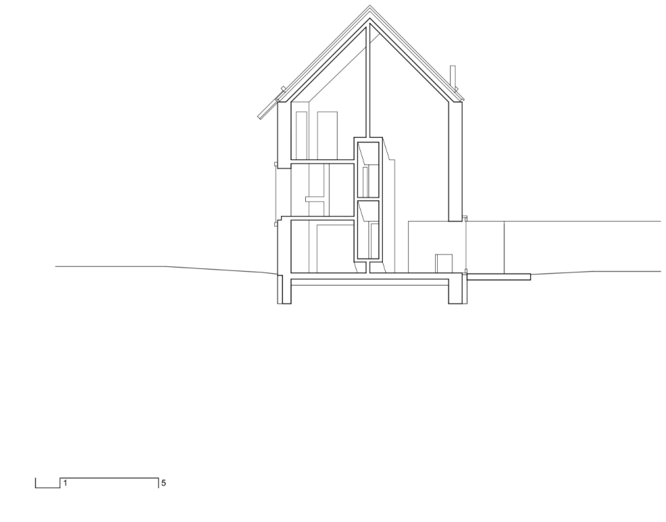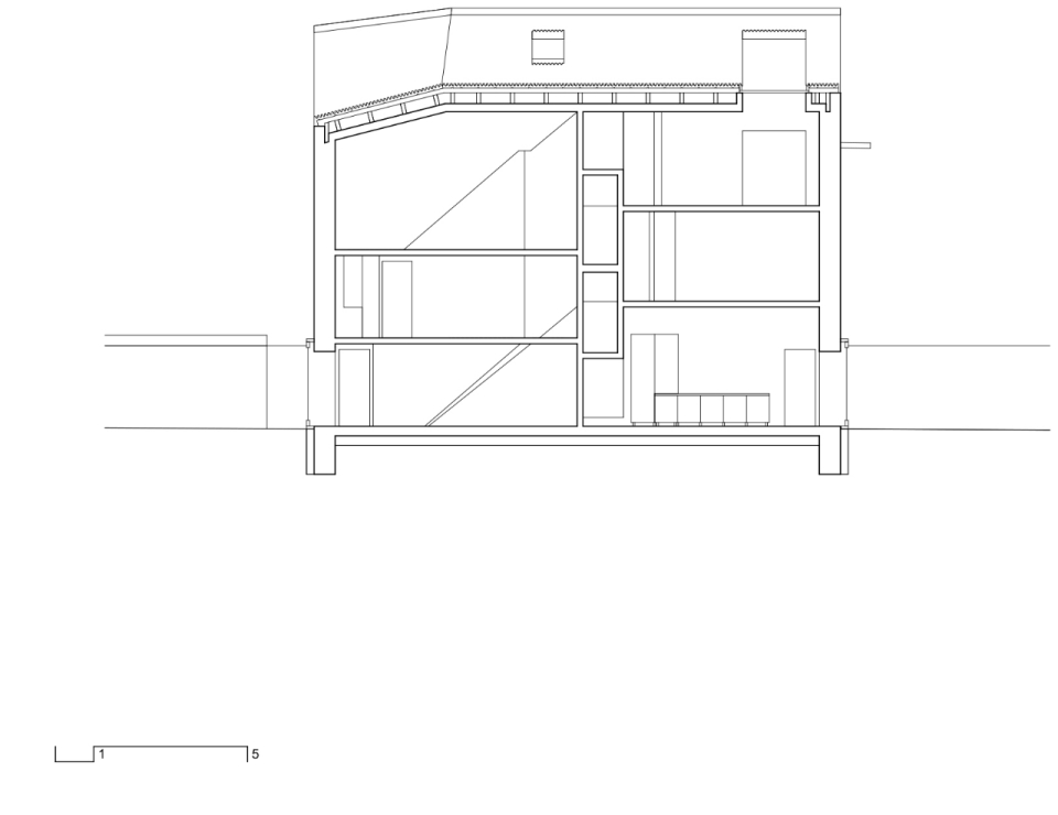 The two ramps define independent paths, never intersecting yet always adjacent: one leads to two rooms offset by half a floor, the other to a vertical sequence culminating in the highest space of the house. Thus, although physically close, the rooms seem distant, separated by a principle of discontinuity that becomes the dwelling’s defining element.