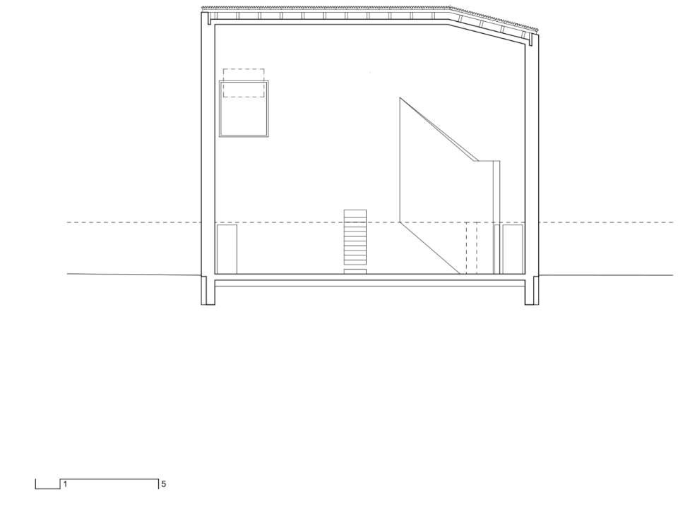 The wall fence from the outside invites toward the entrance of the dwelling and continues into the interior space, which opens longitudinally toward the garden. This space, more than ten meters high, twelve meters long and just over three meters wide, is configured as an empty half of the dwelling, a place suspended between inside and outside, between house and garden.