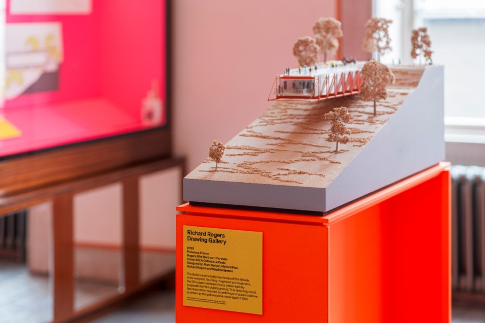 Within the acoustically intimate, Georgian proportions of the Soane house, a recording of Rogers’ voice recalls the inspiration he took from a wristwatch his mother gave him that had colourfully exposed mechanics. He talks about the act of “humanising of parts” so that people can read them, and how that becomes integral to design that serves individuals and societies. He goes on to describe being influenced by Italian ideas of humanism in his formative years – he was born in Florence in 1933.