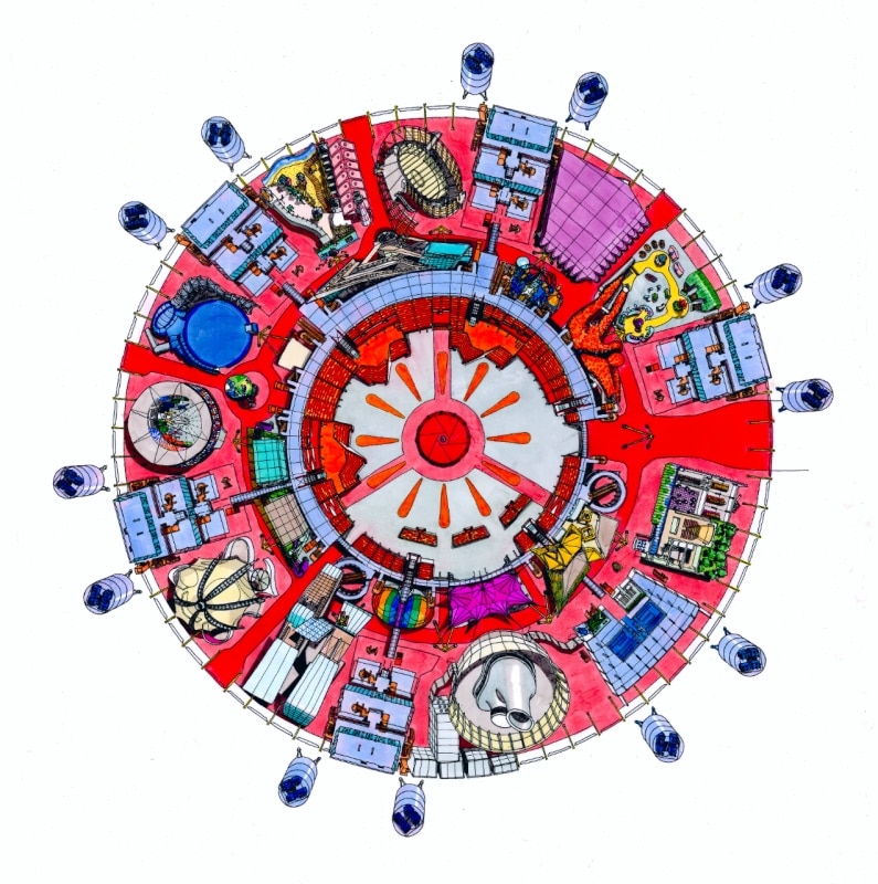 The exhibition naturally includes Rogers’ most iconic and well-known projects – Centre Pompidou (1977) by Piano + Rogers, and Terminal 4 at Madrid-Barajas Airport (2005) by Richard Rogers Partnership – exhibited in intricate models and arresting large-scale drawings. And then in Rogers’ 1999 design for London’s Millenium Dome, the expression of democratic design is defined by adaptability. Resembling a pop-art poster, the plan colourfully reveals the project’s original design for 12 pavilions, laid out internally in sundial format. It describes ideas of “maximum versatility” and ‘non-hierarchical” spaces, which could support a future of public entertainment and events without boundary.