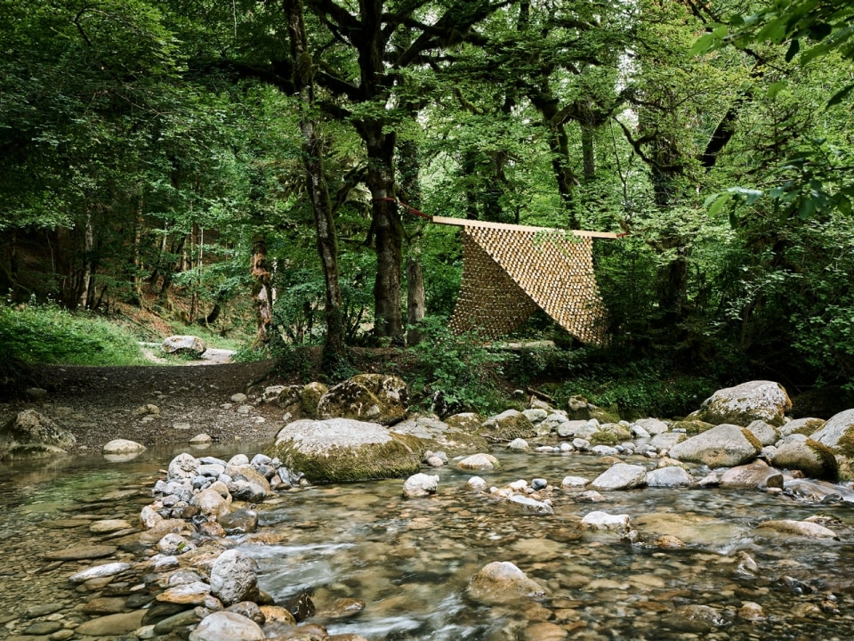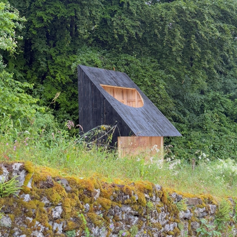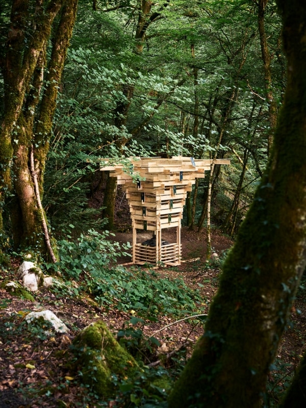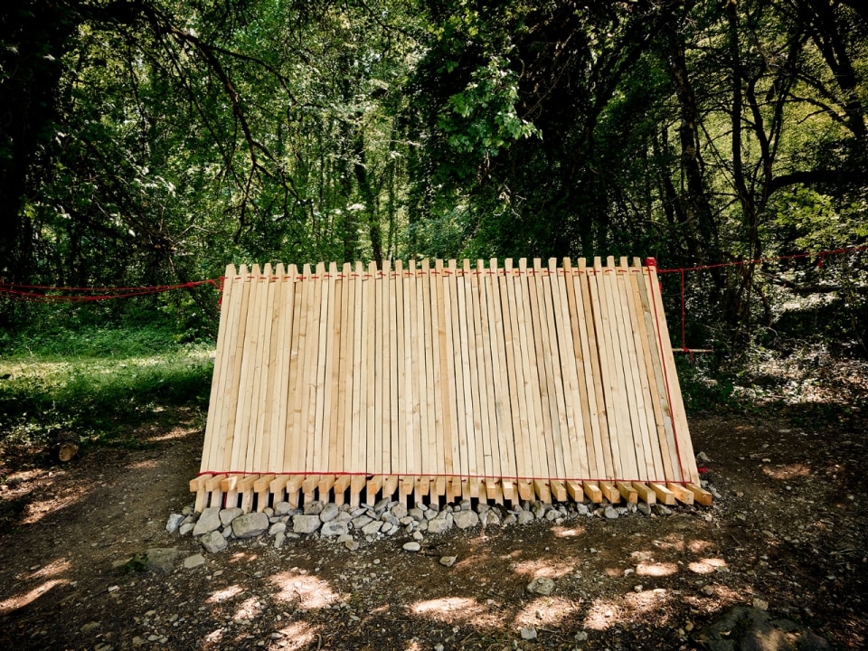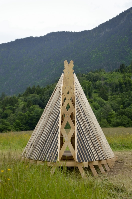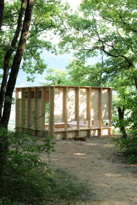 This year, thirteen huts are spread along a 20-kilometer route between the municipalities of Lathuile and Faverges. What unites them all is a symbiotic relationship with their surroundings: among them, “Le Carrières”, a cube set on a hillside blending into rock and vegetation, and, at the other end of the spectrum, the “Meditation Cabin”, which stands out for its lightness.