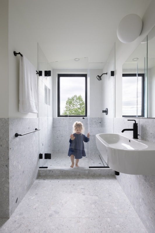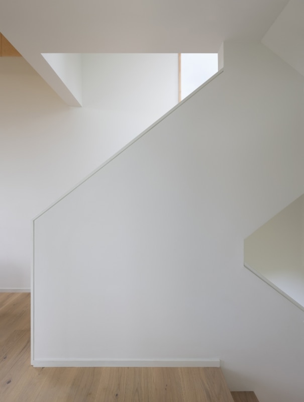 In contrast with the dark tones of the exterior cladding, the interiors unfold as crisp and luminous spaces, thanks to immaculate walls, light-wood finishes, and the natural light filtering through generous glazed surfaces.