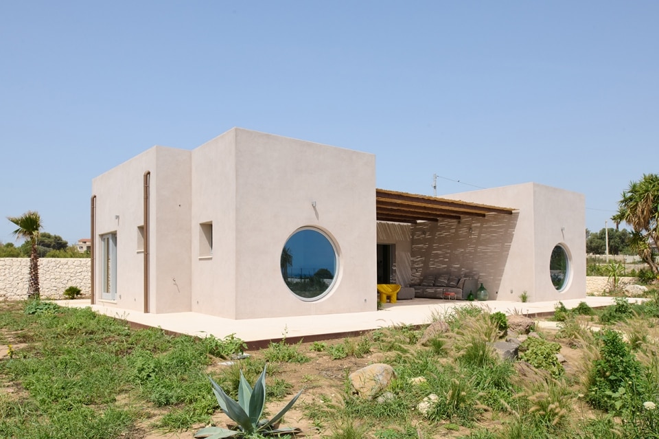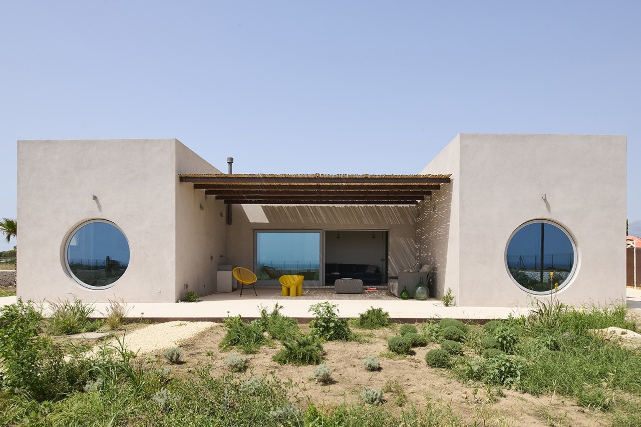 The side volumes of the dwelling accommodate the bedrooms, characterized by large porthole windows, which project the inhabitants toward the seascape of the eastern Sicilian coast.