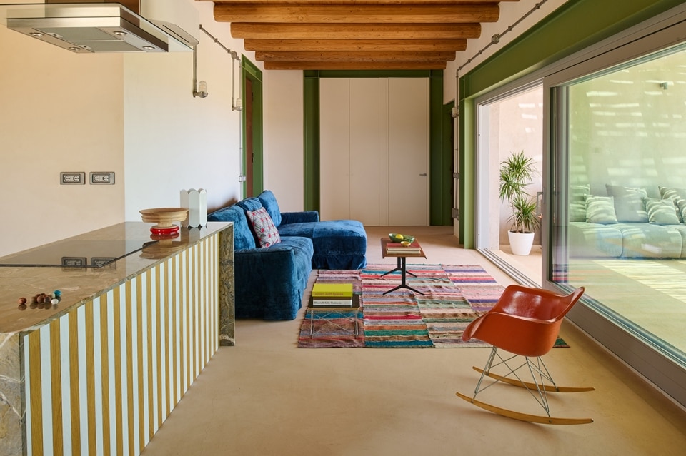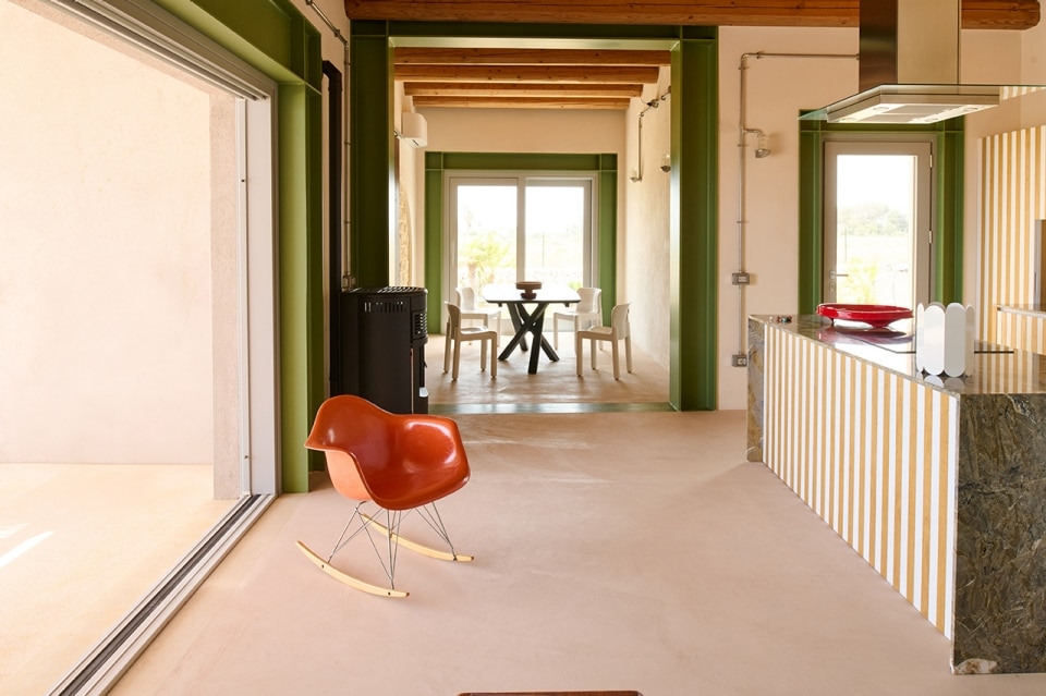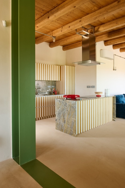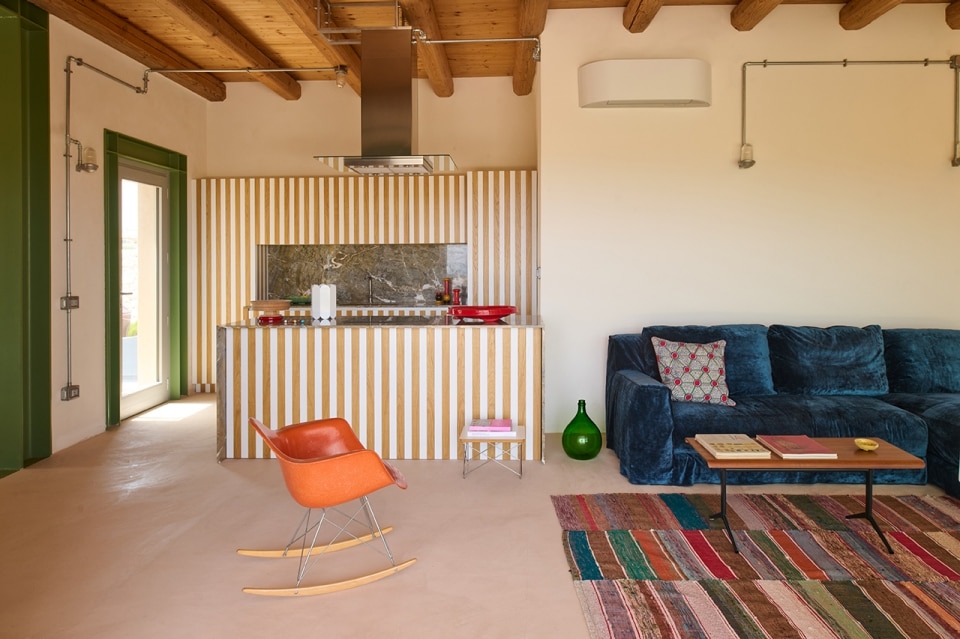 Inside, spaces are organized around the large central core of the kitchen, set in a custom-built cabinet with striped oak slats, its image replicated in the kitchen island, recalling the classic striped aesthetics of classic beach resorts.